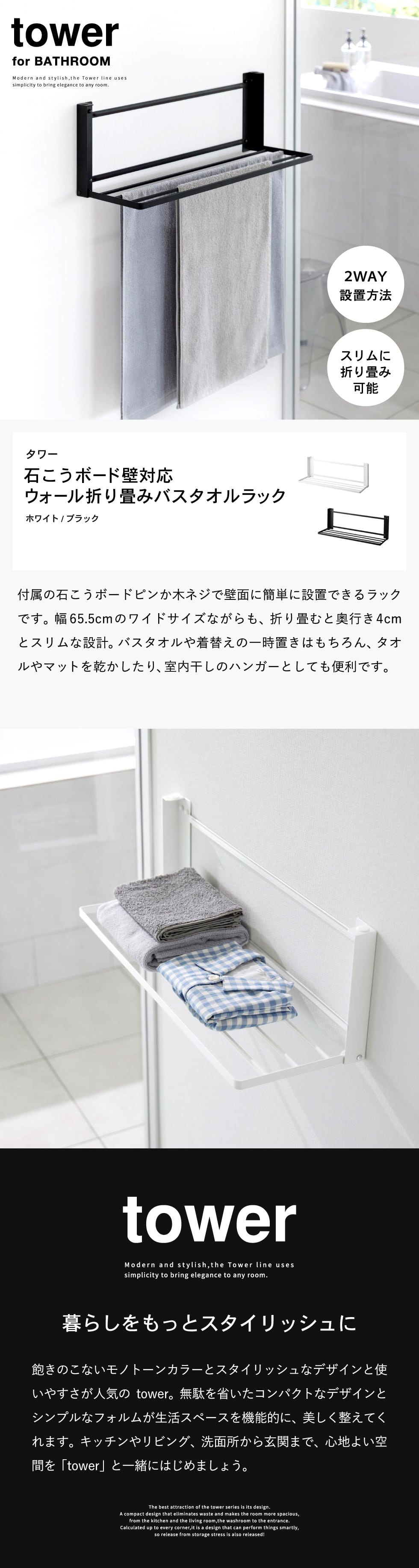| ウォール折り畳みバスタオルラック タワー 石こうボード壁対応 |