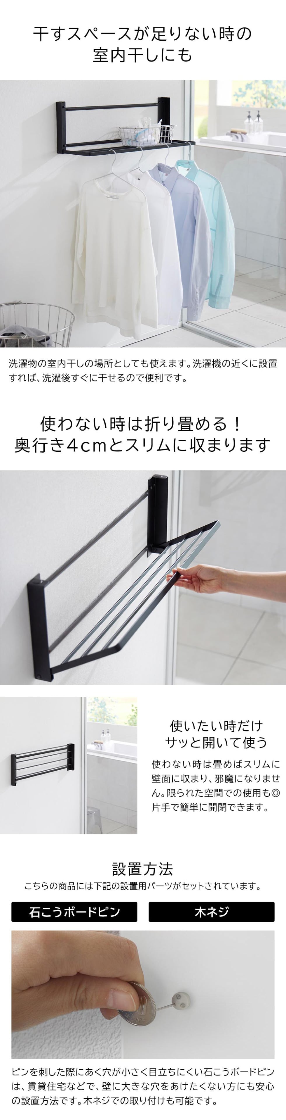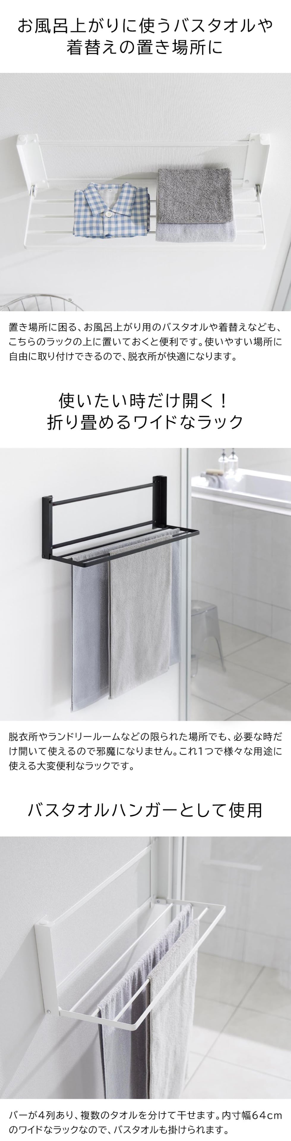 付属の石こうボードピンか木ネジで壁面に簡単に設置できるラックです。使いたい時だけサッと広げて、使わない時は折り畳めるスリムな設計。幅65.5cmのワイドサイズながらも、折り畳むと奥行き4cmと邪魔になりません。バスタオルや着替えの一時置きはもちろん、タオルやバスマットを乾かしたり、洗濯物の室内干しをする際のハンガーとしても使えて便利です。