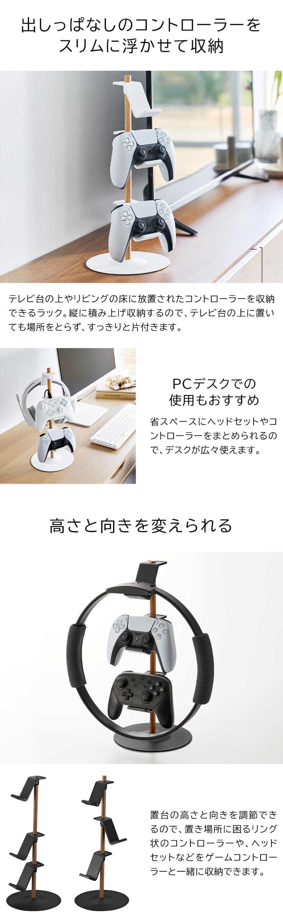 ゲームコントローラーを縦に並べてスリムに収納できるラックです。省スペースに置けるので、デスクやPC周りにもおすすめ。置台の高さと向きを自由に調節できるので、置き場所に困るヘッドセットやリング状のコントローラーなどを、ゲームコントローラーと一緒に収納できます。置いたまま充電可能で、またケーブルは置台にホールドできるので、毎回の充電がスムーズです。置台はシリコーンのクッション付きでコントローラーを傷つけにくい仕様。ナチュラルな天然木のバーとスタイリッシュなスチールが組み合わさった、様々なインテリアに合うデザインです。