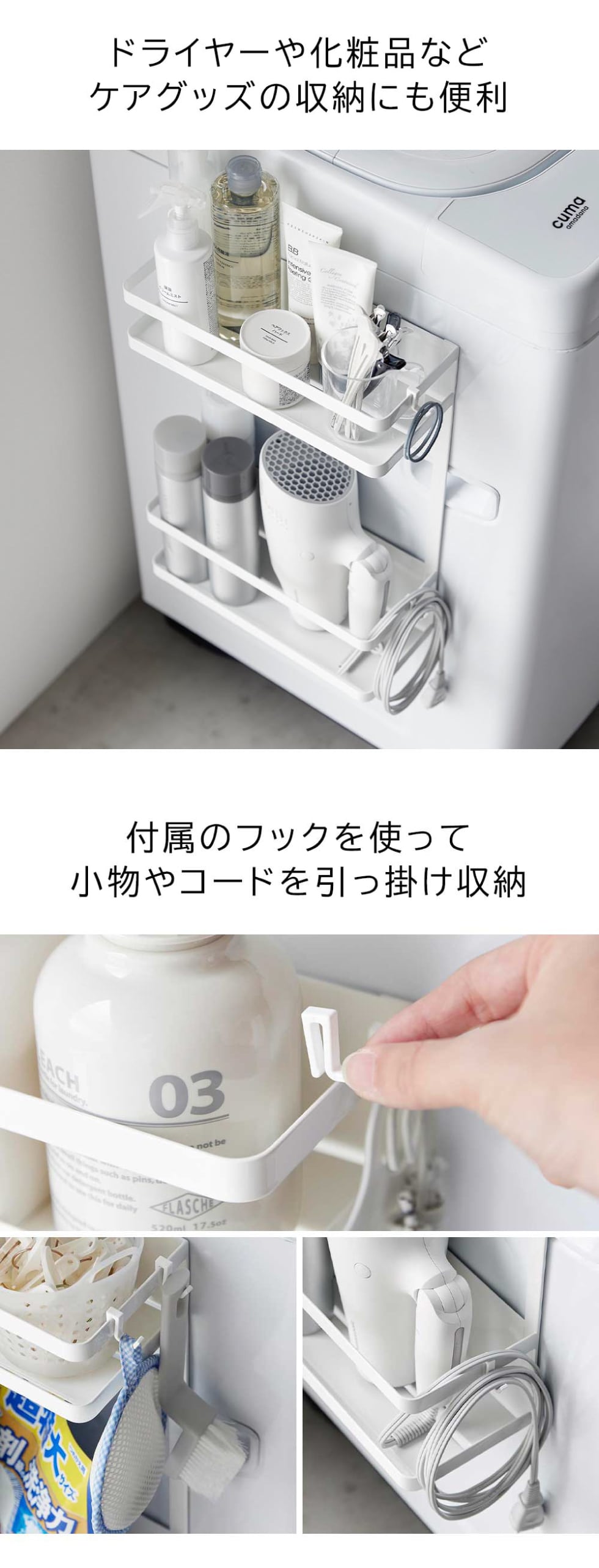■洗濯機横に簡単に設置できる大容量ラック マグネットで洗濯機横に簡単に設置できるラックです。奥行きが10.8cmで、特大サイズの詰め替えパックやボトル類、ヘアドライヤーもすっぽり収まる大容量。上下段それぞれに落下防止のガードが付いており、ボトルや液体洗剤のパックも立てて収納できます。付属のフックを取り付ければ、お掃除ブラシや洗濯ネット、輪ゴムなど、小物の引っ掛け収納も可能。洗濯小物以外にもヘアドライヤーや化粧品などの収納にも便利です。