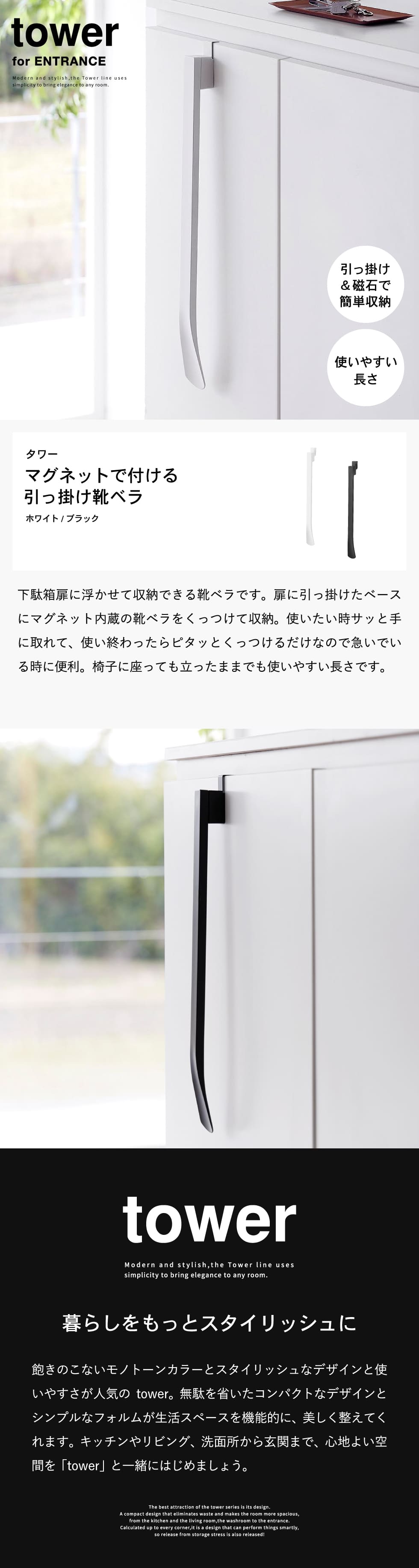 ホワイトとブラックを中心とした飽きのこないモノトーンカラーと、どんなインテリアにもスッと馴染むスタイリッシュなデザイン。そして、とことんシンプルながら、より豊かな暮らしを提案するアイデアがたくさん詰まった、使いやすいアイテムが人気です。無駄を省いたコンパクトなデザインと、シンプルなフォルムが生活スペースを機能的に、美しく整えてくれます。towerのアイテムをライン使いすれば、すっきりとした統一感が生まれ、お洒落でシックな雰囲気を演出します。キッチンやリビング、洗面所から玄関まで揃えたくなるtowerシリーズで、毎日の暮らしを彩る心地よい空間を。