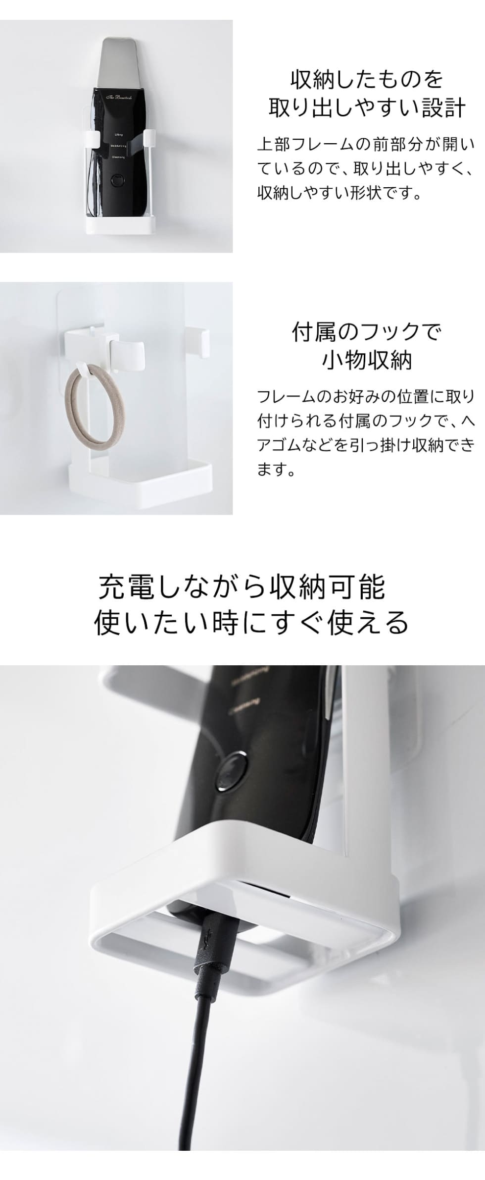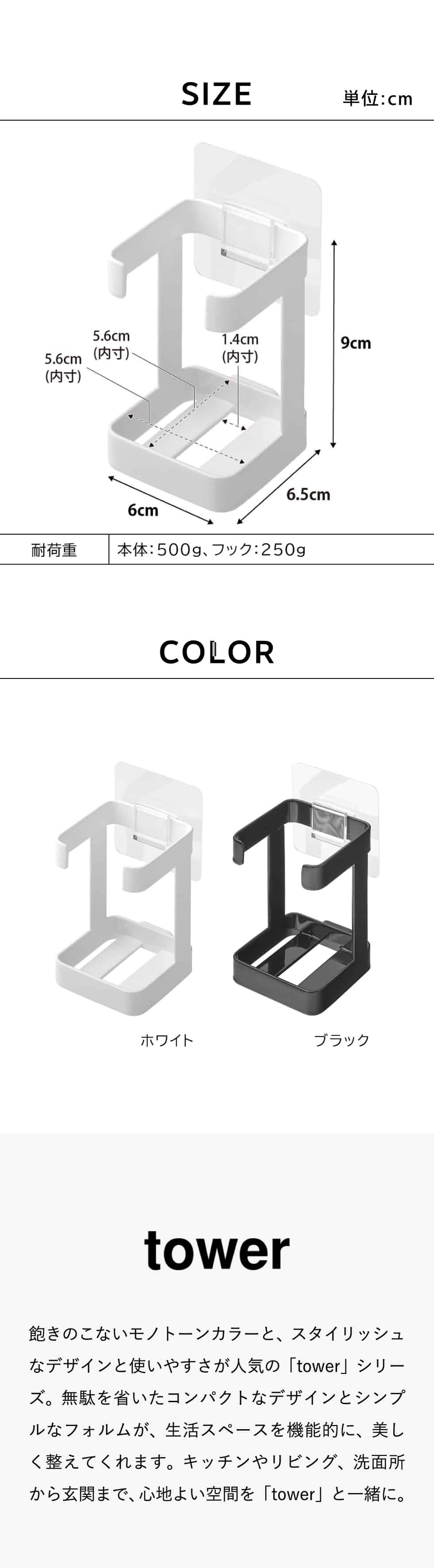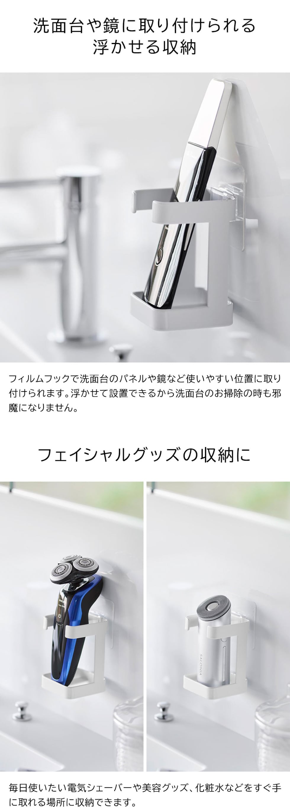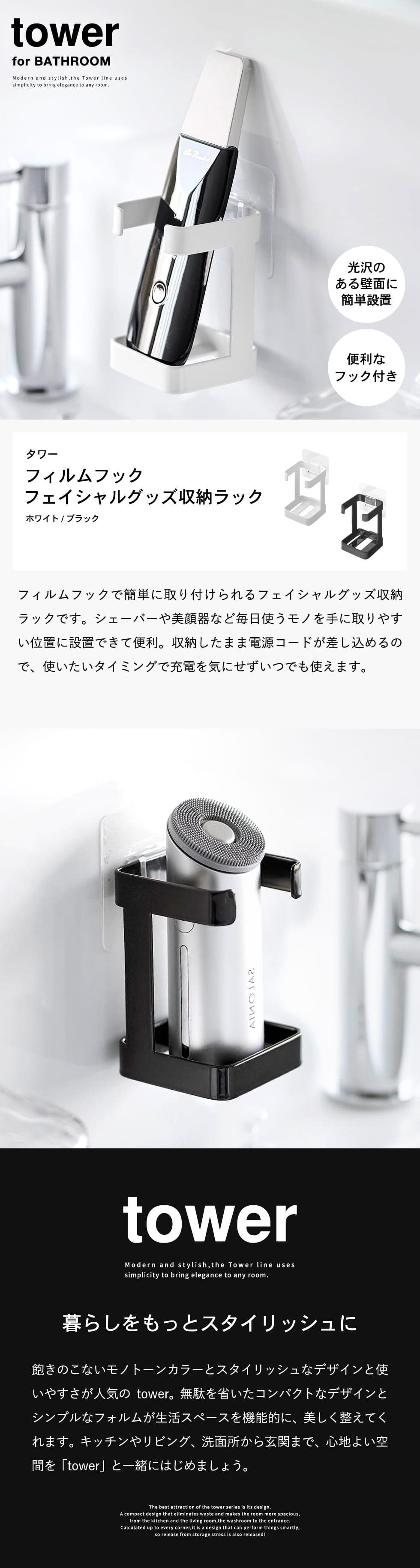 フィルムフックで浮かせて設置!電気シェーバーや美容グッズを充電したまま収納できるラックです。使いたい時にすぐ手に取れる場所にすっきりと収納できます。 タワーシリーズ