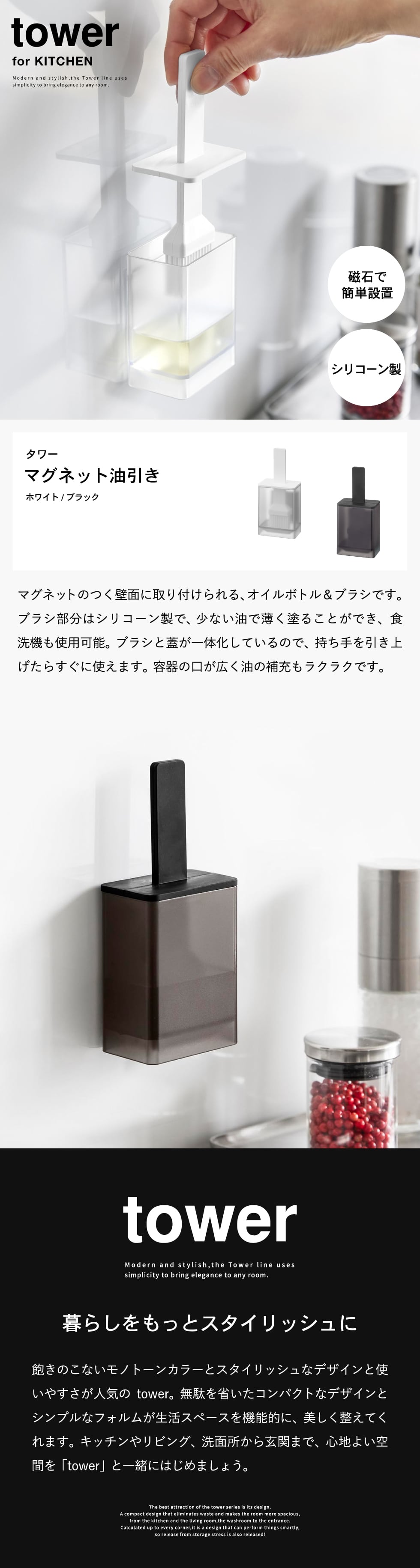 ホワイトとブラックを中心とした飽きのこないモノトーンカラーと、どんなインテリアにもスッと馴染むスタイリッシュなデザイン。そして、とことんシンプルながら、より豊かな暮らしを提案するアイデアがたくさん詰まった、使いやすいアイテムが人気です。無駄を省いたコンパクトなデザインと、シンプルなフォルムが生活スペースを機能的に、美しく整えてくれます。towerのアイテムをライン使いすれば、すっきりとした統一感が生まれ、お洒落でシックな雰囲気を演出します。キッチンやリビング、洗面所から玄関まで揃えたくなるtowerシリーズで、毎日の暮らしを彩る心地よい空間を。