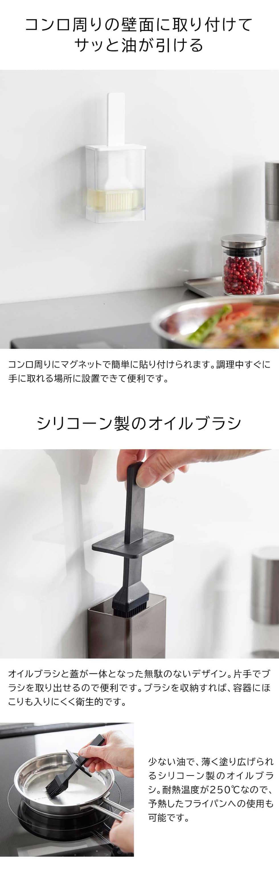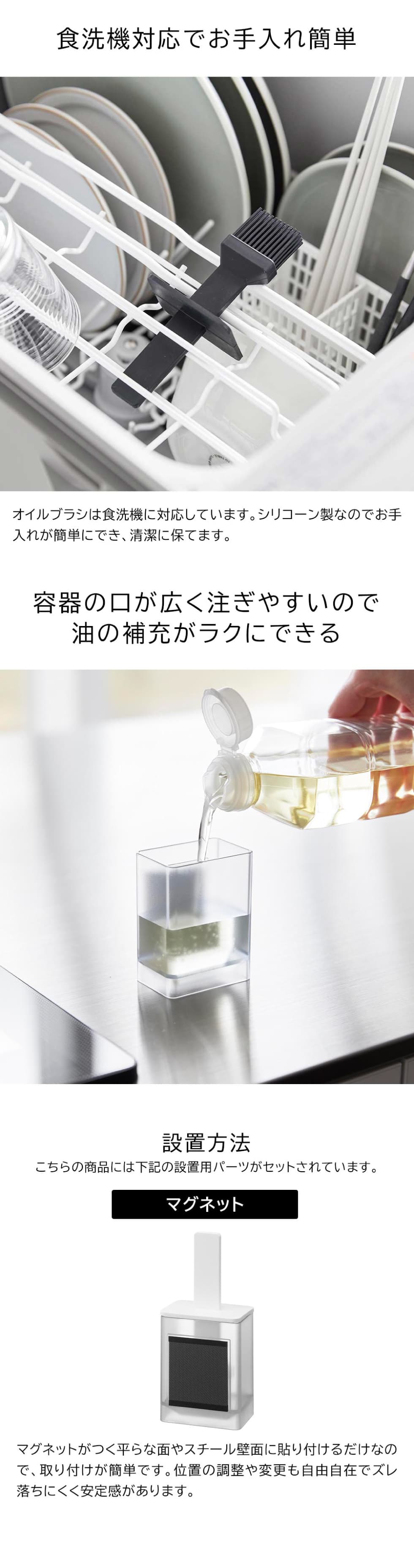 コンロまわりなどマグネットのつく壁面に、簡単に取り付けできるオイルボトル&オイルブラシです。必要な時にサッと手に取れて、少ない油で薄く塗り広げられます。ブラシと容器の蓋が一体化しており、容器にほこりが入りにくく衛生的。容器の口が広く注ぎやすいので、油の補充もラクにできます。オイルブラシはシリコーン製で食洗機で洗えます。
