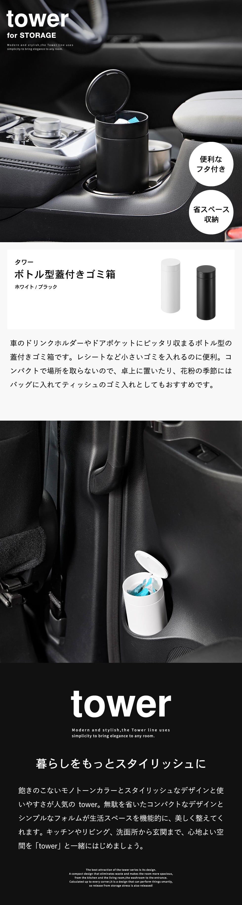ホワイトとブラックを中心とした飽きのこないモノトーンカラーと、どんなインテリアにもスッと馴染むスタイリッシュなデザイン。そして、とことんシンプルながら、より豊かな暮らしを提案するアイデアがたくさん詰まった、使いやすいアイテムが人気です。無駄を省いたコンパクトなデザインと、シンプルなフォルムが生活スペースを機能的に、美しく整えてくれます。towerのアイテムをライン使いすれば、すっきりとした統一感が生まれ、お洒落でシックな雰囲気を演出します。キッチンやリビング、洗面所から玄関まで揃えたくなるtowerシリーズで、毎日の暮らしを彩る心地よい空間を。
