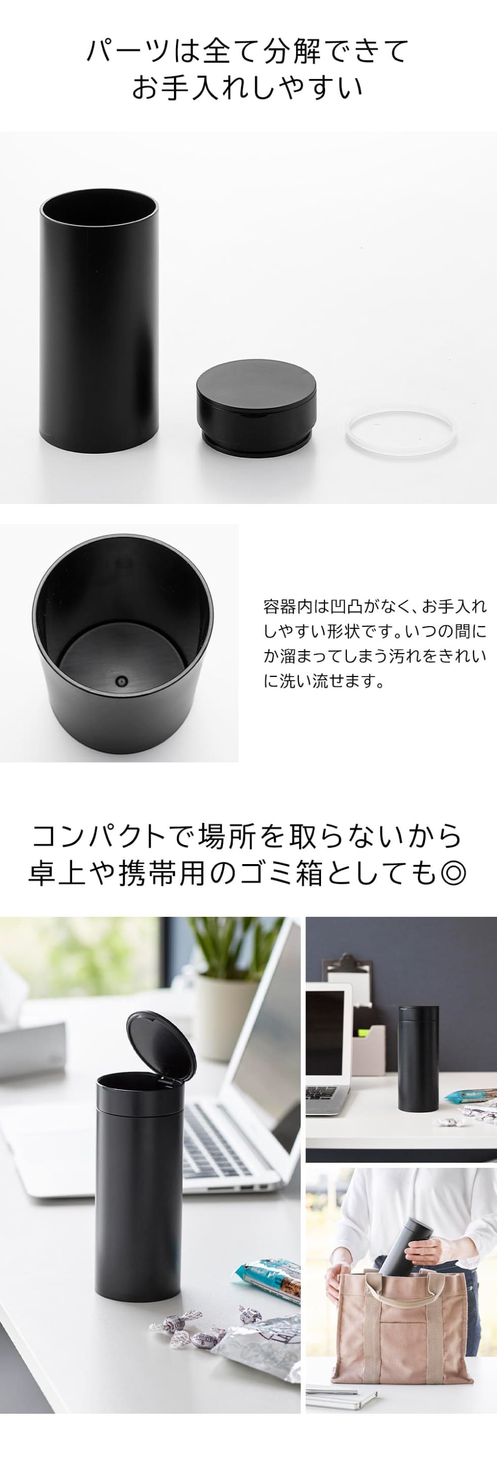 車のドリンクホルダーやドアポケットにぴったり収まるボトル型の蓋付き(フタ付き)ゴミ箱です。レシートをはじめ、ガムやチョコレートの包み紙など小さいゴミを入れるのにちょうどいいサイズ感。蓋付きで捨てた物が見えないので、すっきりと気持ちのいい車内を保てます。スリムでコンパクトな形状なので、洗面所など限られたスペースやリビングでの使用もおすすめ。花粉の季節にバッグに入れておけば、ティッシュのゴミ入れとしても便利です。