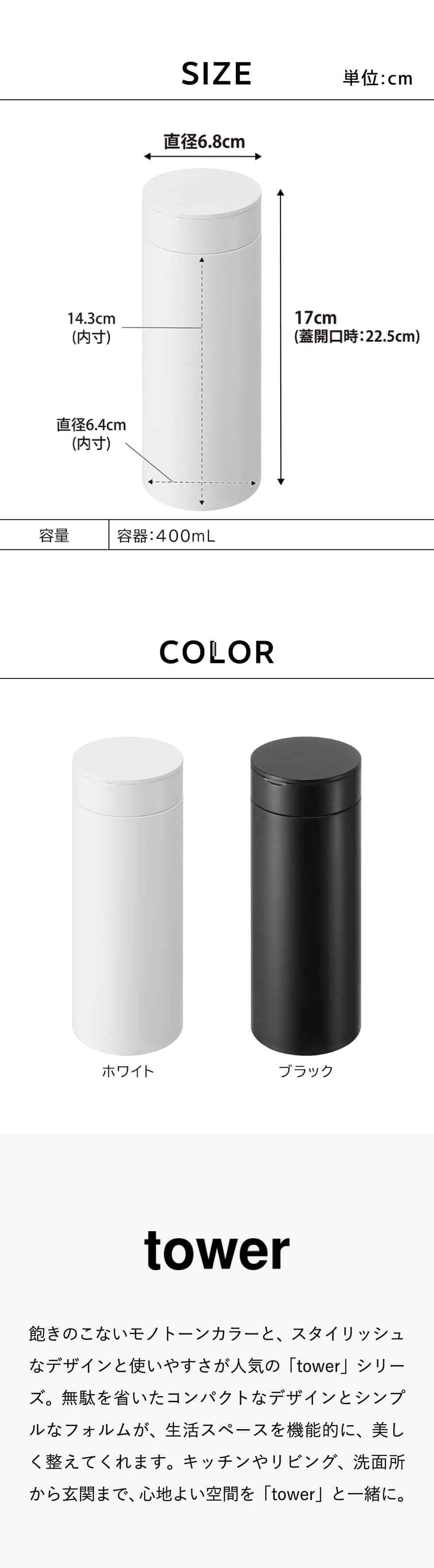 商品サイズ W6.8×D6.8×H17cm 蓋開口時:H22.5cm |