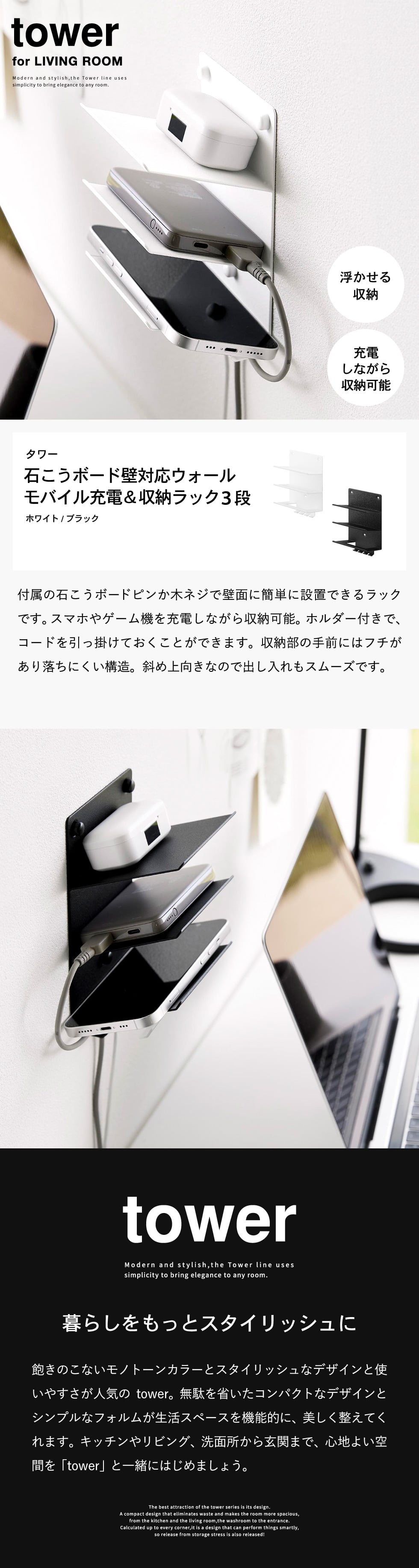 | ウォールモバイル充電&収納ラック タワー 3段 石こうボード壁対応 |