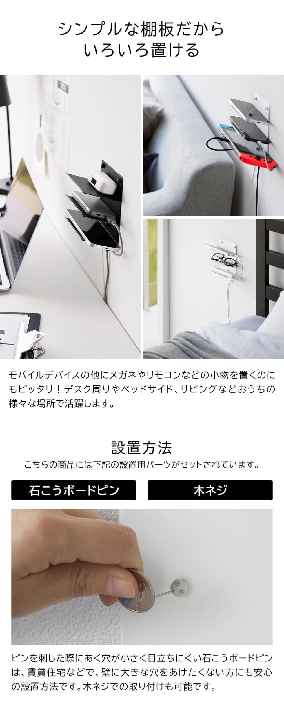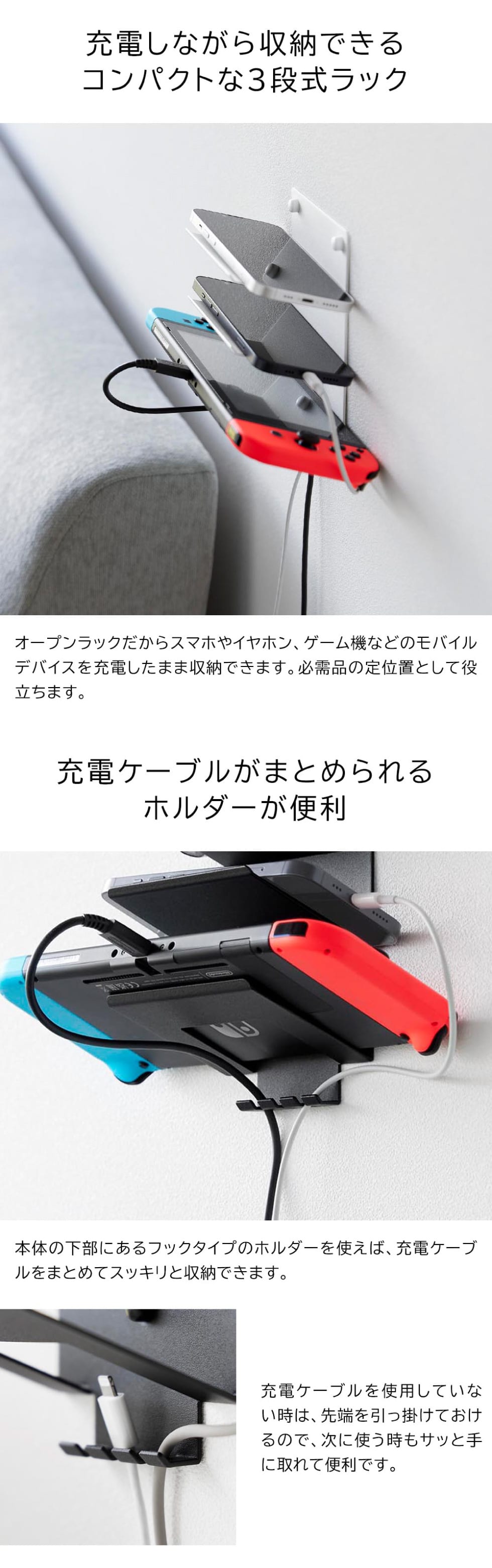 付属の石こうボードピンか木ネジで壁面に簡単に設置できるスマホラックです。スマホやイヤホン、モバイルバッテリー、ゲーム機などを充電しながら収納可能。ホルダー付きで、充電しない時もコードの差し込み口を引っ掛けておくことができます。ベッドサイドに取り付ければ、睡眠時に充電しながら収納でき、リモコンやメガネの収納にも便利。収納部の手前にはフチがあり落ちにくい構造になっており、手前に向かって斜め上を向いているので出し入れもスムーズです。