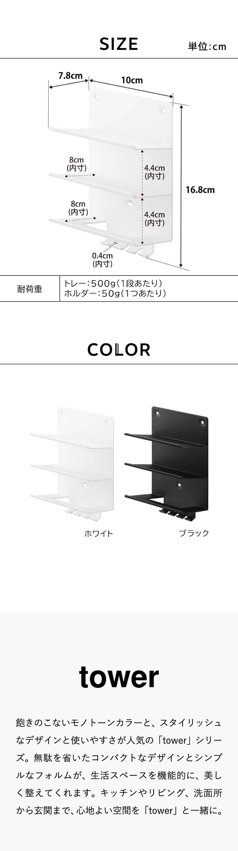 耐荷重 トレー:500g(1段あたり) ホルダー:50g(1つあたり) |