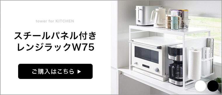 置き場に困るホットプレートやカセットコンロの収納にピッタリです。縦にスペースを作ることで、見た目もスッキリ収納できます。スチールパネルは、キッチンレイアウトに合わせて左右どちらでも取り付け可能です。別売りのキッチントレーホルダー2個組を追加して、オーブンやホットプレートの天板をまとめて収納するのもおすすめです。