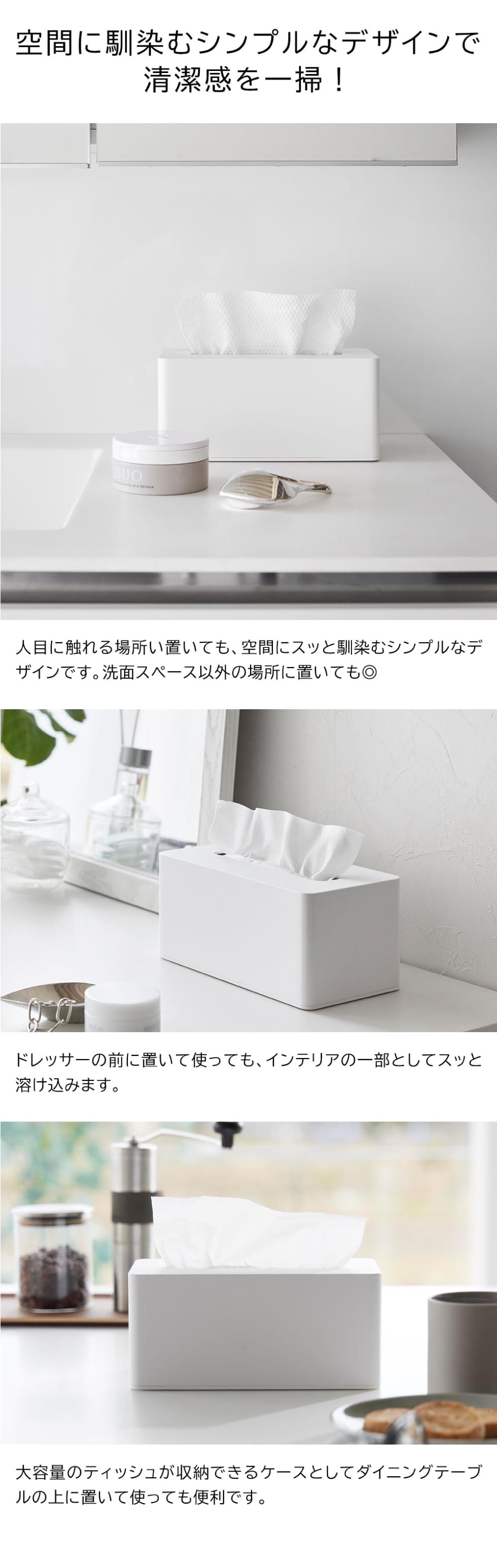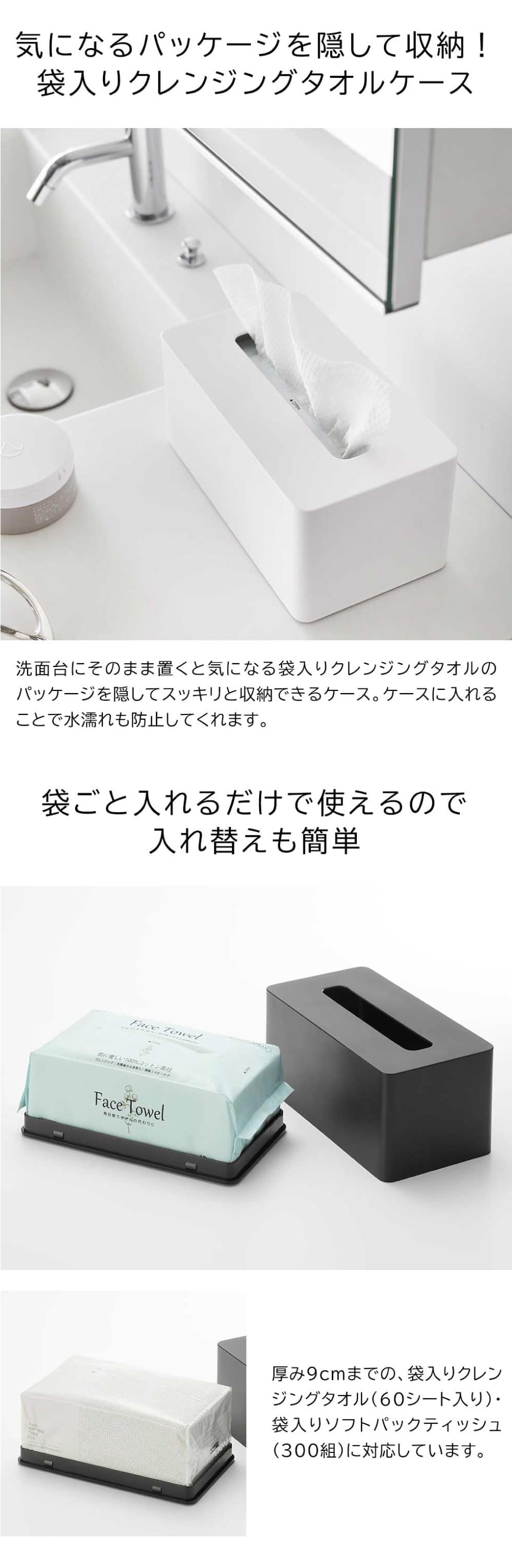 クレンジングタオルを袋ごと収納できるケースです。厚み9cmまでのクレンジングタオルや300組までのソフトパックティッシュをスッキリ収納可能。洗面後の手に取りやすい場所やドレッサーに置いて、サッと引き出せて便利です。袋ごと入れるだけなので、入れ替えも簡単に行えます。