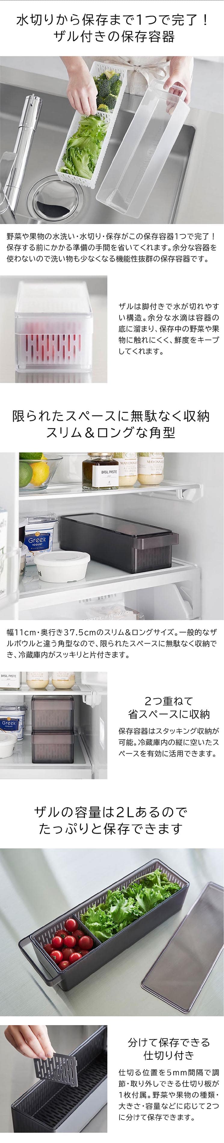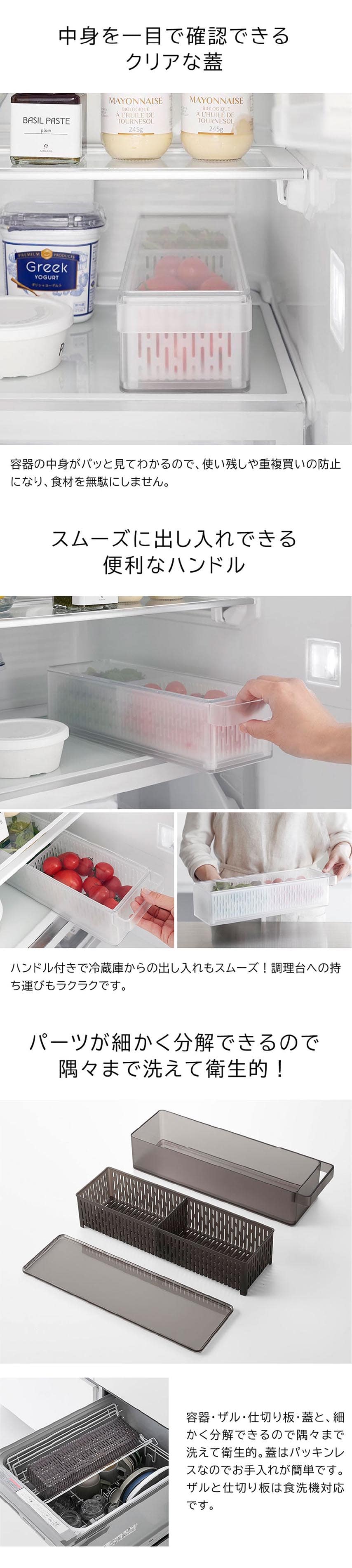 冷蔵庫中収納シリーズを並べて冷蔵庫の中をスッキリ整頓!冷蔵庫の奥まで無駄なく使えて、野菜や果物の水切りができるザル付きの保存容器。積み重ねて収納できるのでスペースを有効活用できます。ザル・仕切りは食洗機で洗えます。