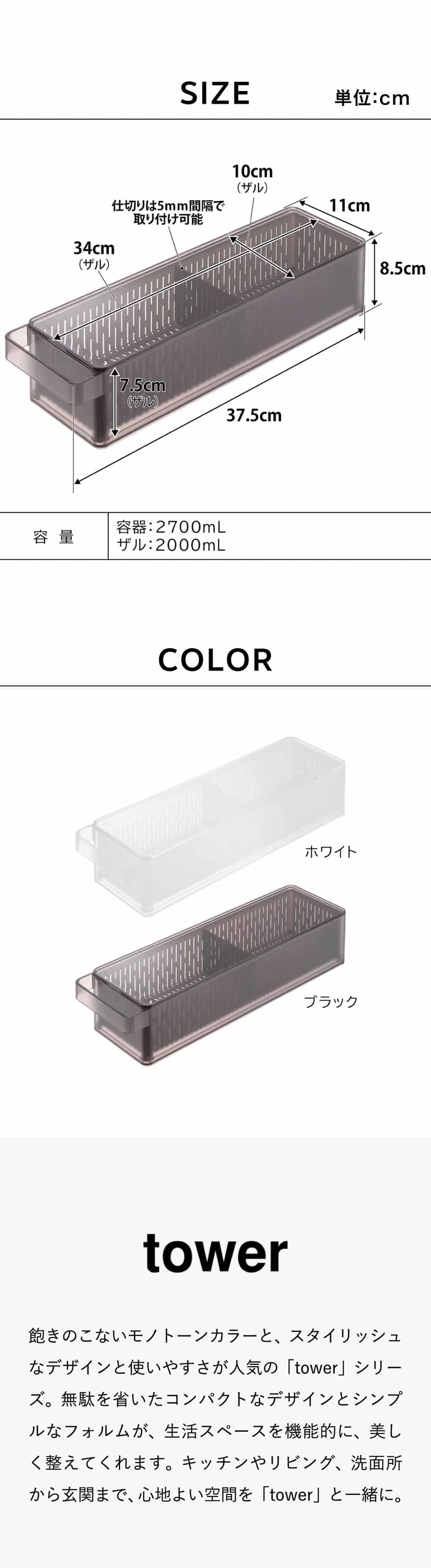 商品サイズ 容器:W37.5×D11×H8.5cm ザル:W34×D10×H7.5cm |
