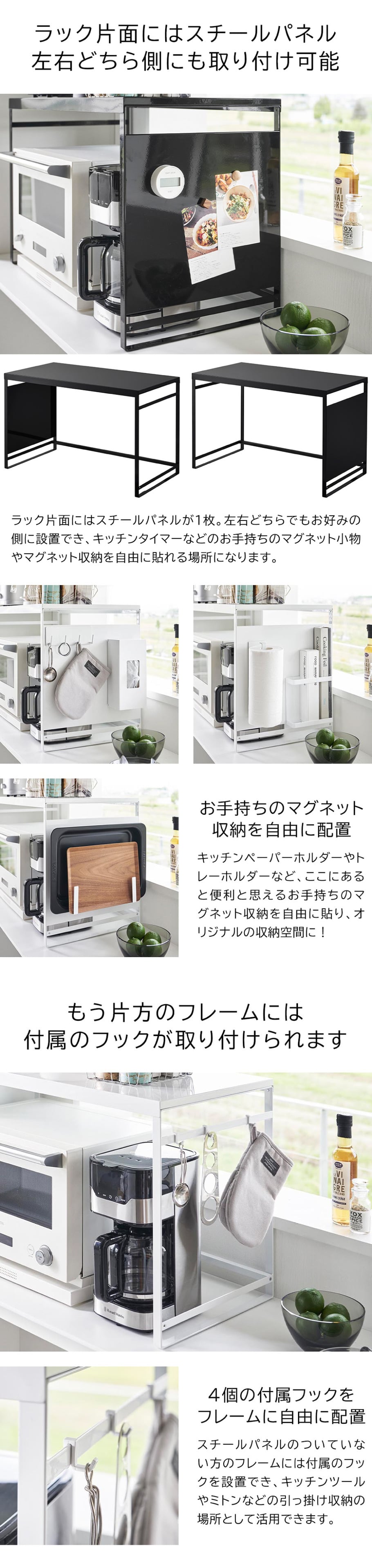 オーブンレンジまわりの収納量がUPするスチール製のレンジラック。お手持ちのマグネット小物が貼れるスチールパネルや引っ掛け収納ができるフックも付属で多彩な収納が可能!