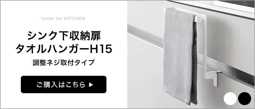 引き出しや扉に挟むだけの簡単設置!キッチンのタオルで手を拭いた時の滑り落ち防止に便利なタオルハンガーです。 タワーシリーズ