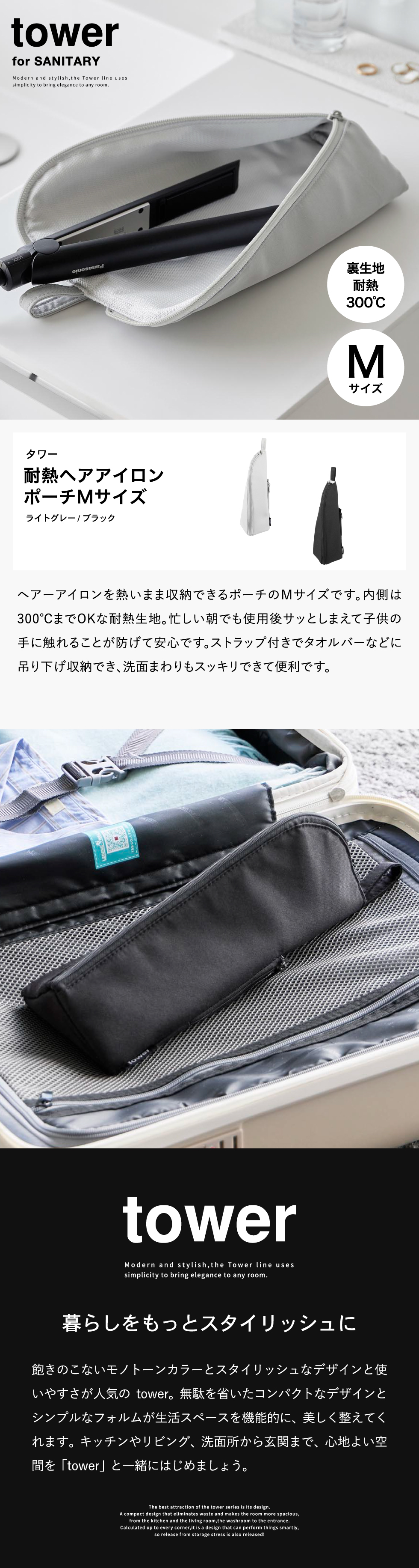 (土・日発送可) 耐熱ヘアーアイロンポーチ タワー M 山崎実業 公式 tower 1381 1382 ライトグレー ブラック 送料無料