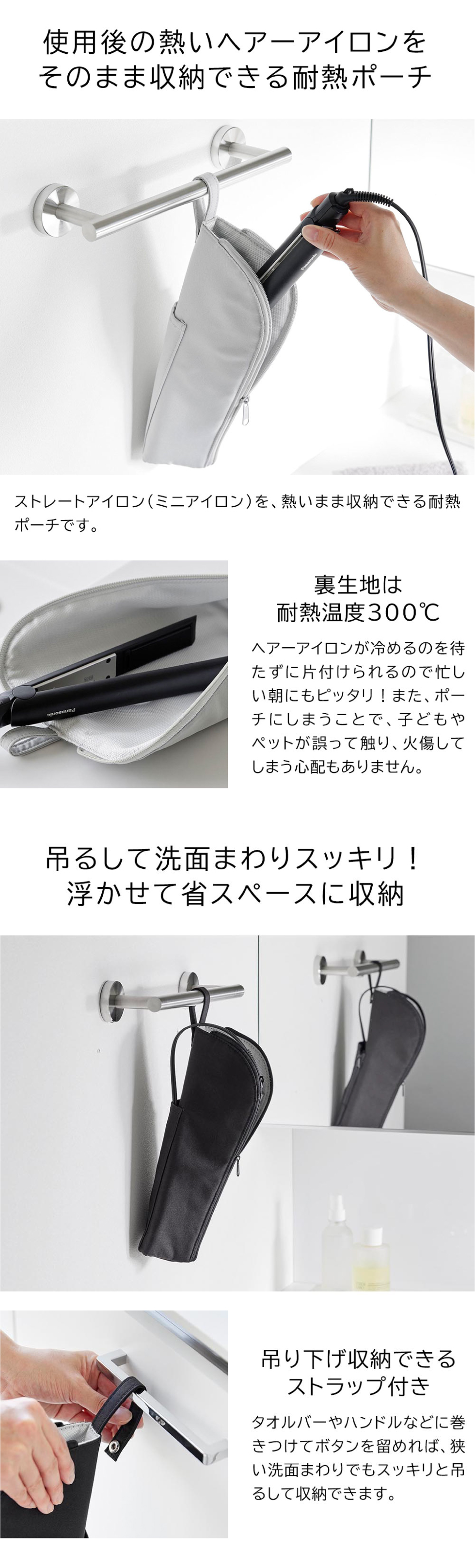 熱々のヘアーアイロンをそのまま収納できる耐熱温度300℃のポーチMサイズ。ポーチにしまえば誤って触れることがなく火傷防止に。狭い洗面まわりでも吊るしてスッキリ浮かせて収納。