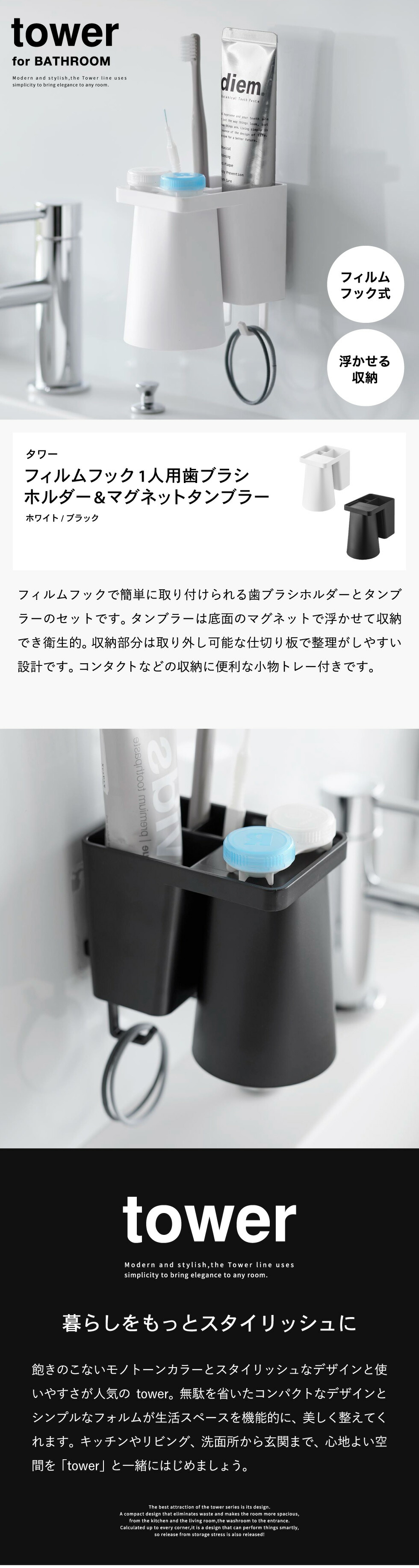 [ フィルムフック1人用歯ブラシホルダー&マグネットタンブラー タワー ] 山崎実業 公式 tower 1295 1296 ホワイト ブラック / マグネットタンブラー うがい コップ 歯ブラシホルダー 歯磨き粉 歯ブラシ スタンド マグネット