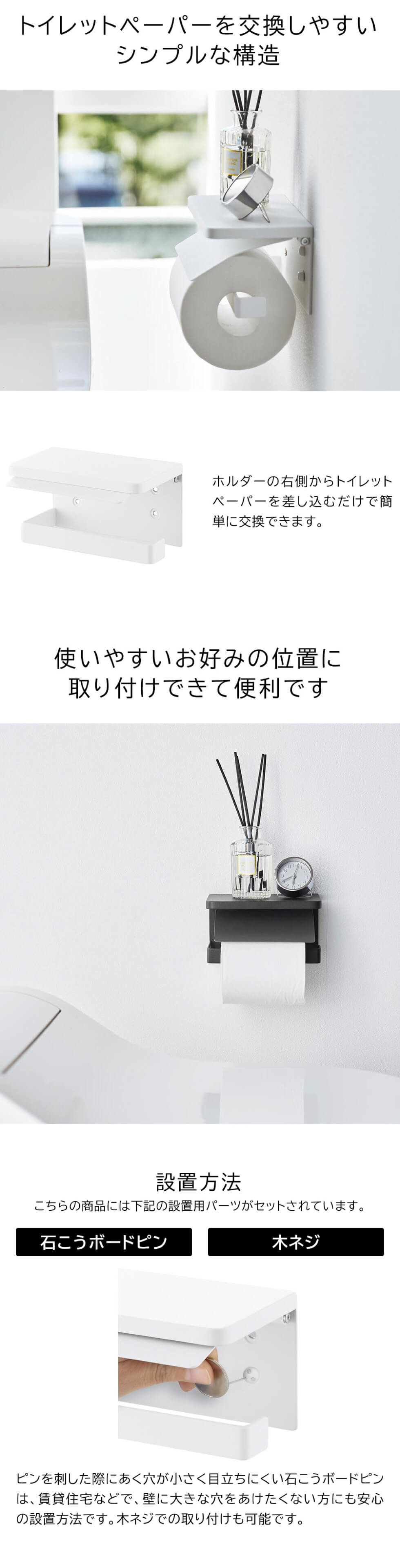 石こうボードピンで簡単に取り付けできるトイレットペーパーホルダー。天板とホルダーが一体化したシンプルなデザイン。お好みの位置に取り付けることができます。