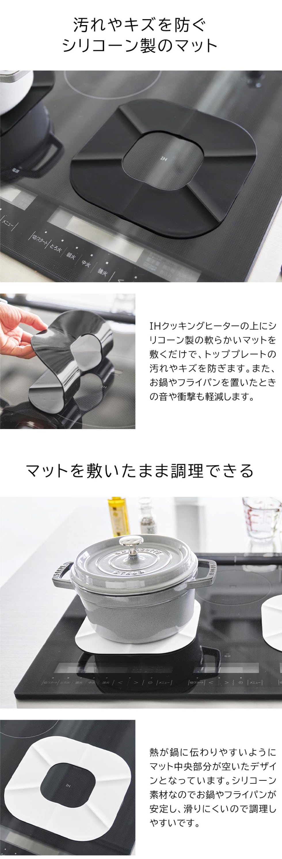 IHクッキングヒーターの汚れ・キズを防ぐシリコーン製のマット。マットを敷いたまま調理が可能です。汚れを防ぐだけでなく、調理中のお鍋やフライパンが安定し滑りにくい。