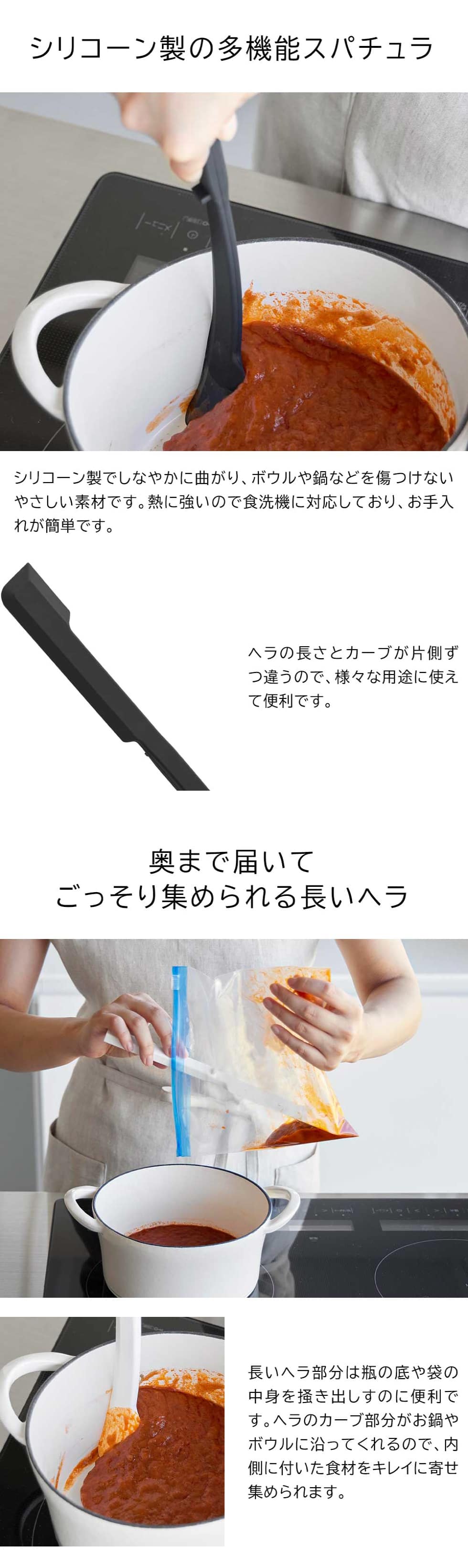 ヘラの長さとカーブが左右で異なるため、用途ごとに使い分け可能な多機能タイプのスパチュラ。鍋やボウルを傷つけにくいシリコーン製。先端が浮き衛生的に一時置き可能。