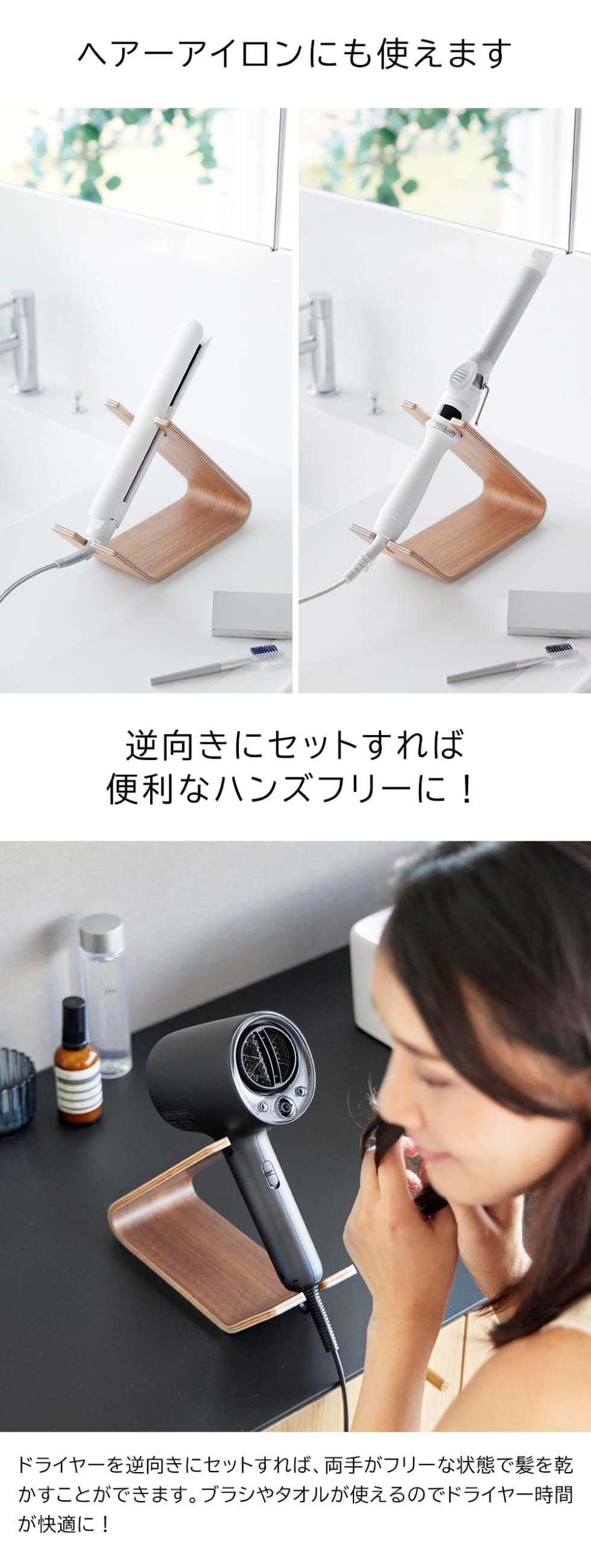 上品な木目のカーブが美しい上質なドライヤー&ヘアーアイロンスタンド。サッと使えて便利です。