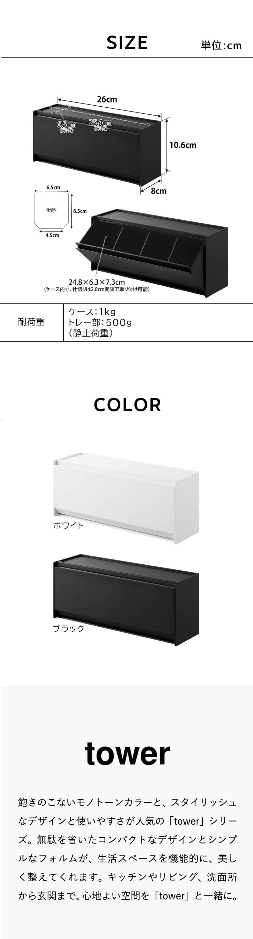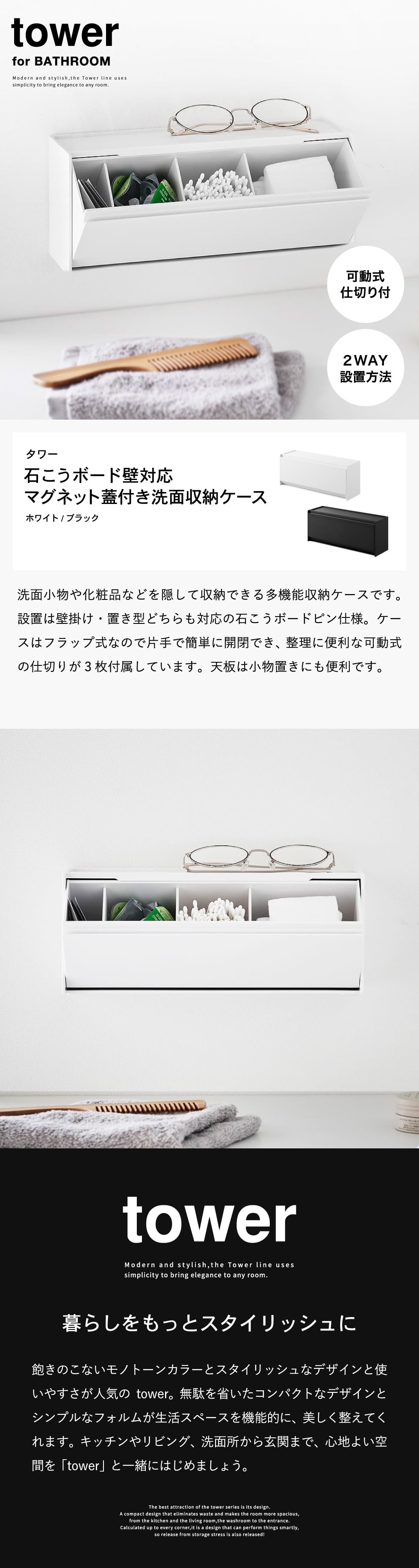 ホワイトとブラックを中心とした飽きのこないモノトーンカラーと、どんなインテリアにもスッと馴染むスタイリッシュなデザイン。そして、とことんシンプルながら、より豊かな暮らしを提案するアイデアがたくさん詰まった、使いやすいアイテムが人気です。無駄を省いたコンパクトなデザインと、シンプルなフォルムが生活スペースを機能的に、美しく整えてくれます。towerのアイテムをライン使いすれば、すっきりとした統一感が生まれ、お洒落でシックな雰囲気を演出します。キッチンやリビング、洗面所から玄関まで揃えたくなるtowerシリーズで、毎日の暮らしを彩る心地よい空間を。