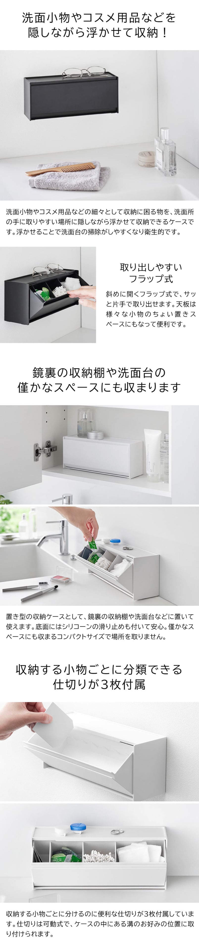 石こうボードピンで壁に付けても置いても使える!洗面小物や化粧品などをスッキリ隠せる収納ケースです。シンプルでスタイリッシュなデザインなので場所を選ばずスマートに設置できます。天板はトレーになっているので小物置きとしても使用可能。ケースはフラップ式なので片手で簡単に開閉でき、整理に便利な可動式の仕切りが3枚付属しています。壁の穴が目立ちにくい石こうボードピンで、浮かせて取り付けられるので衛生的。木ネジでも設置可能。底面にはシリコーンの滑り止めが付いているので、そのまま置いて使用することもできます。スタッキング可能。