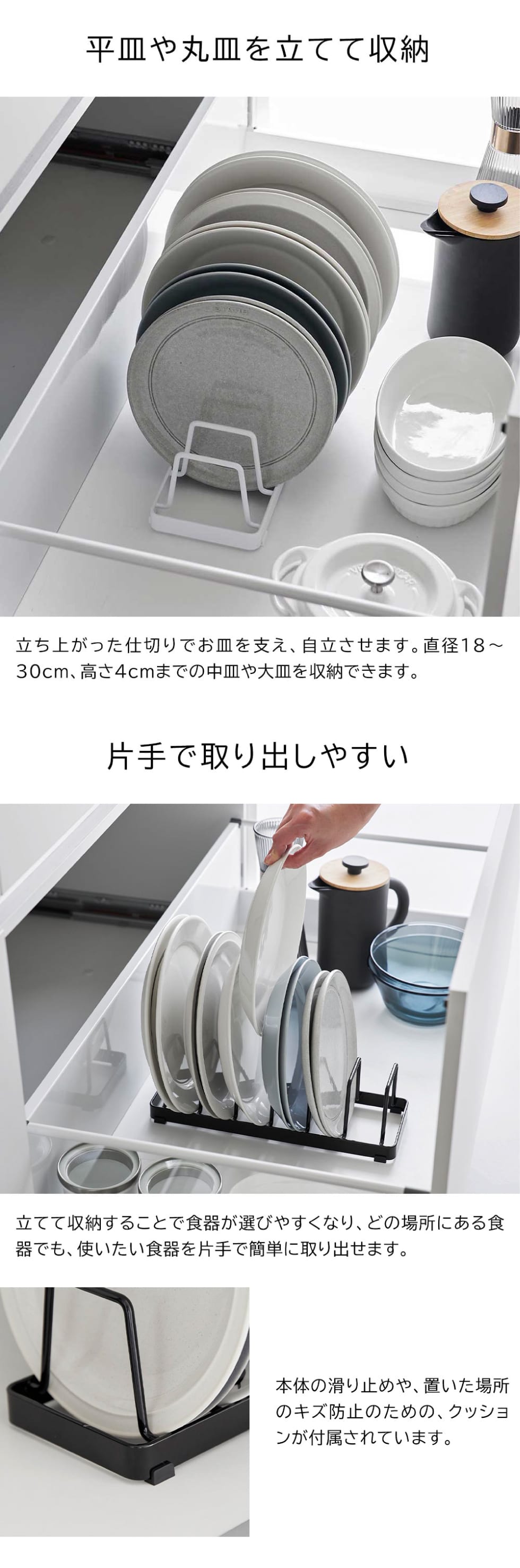 対応サイズ 直径18~30cm・高さ4cmまでのお皿を目安 ※お皿の形状によっては収納できない物もあります。 |