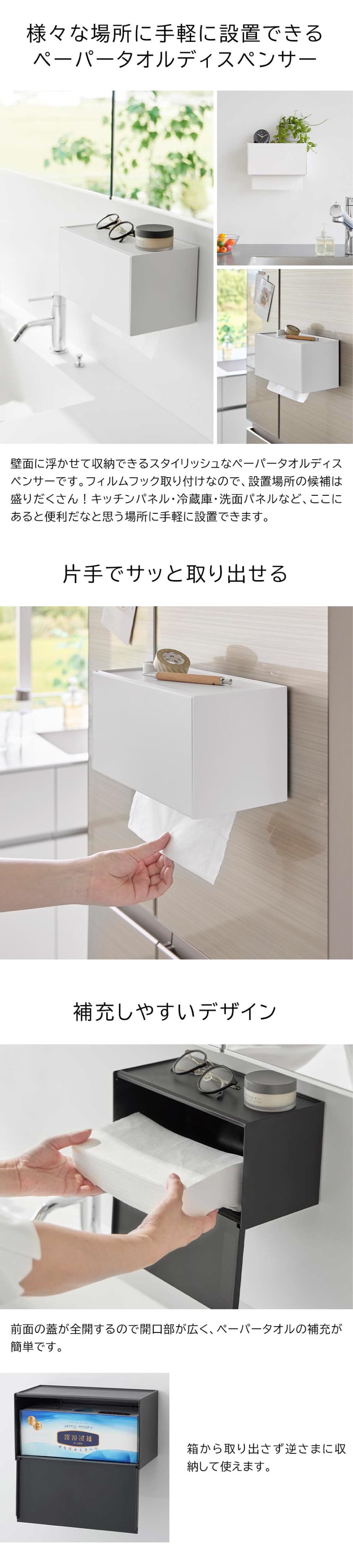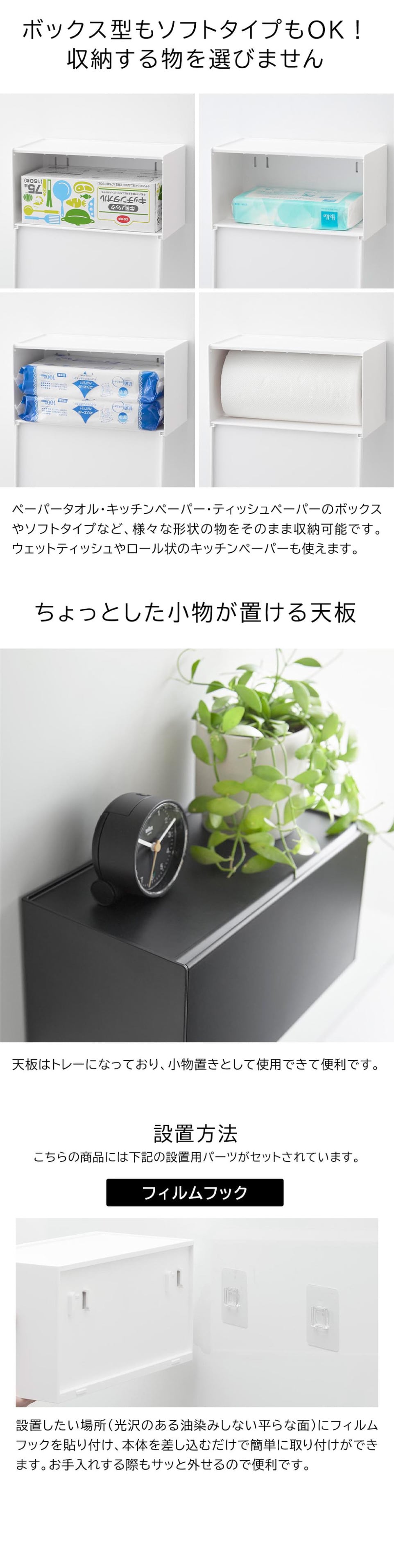 フィルムフックで洗面所やキッチン、冷蔵庫扉などに簡単取り付け!片手でサッと取り出せるペーパータオルディスペンサーです。シンプルでスタイリッシュなデザインなので場所を選ばずスマートに設置できます。天板はトレーになっているので、スパイスボトルなどのキッチン小物置きとして使用できます。前面の蓋は全開し、開口部が広いのでペーパーの補充も簡単。ペーパータオル・キッチンペーパー・ティッシュペーパーのボックスやソフトタイプにも対応。コンロ横に設置すれば、油汚れなどの掃除の際にも便利です。※ガスコンロの火やIHクッキングヒーター・排気口の熱が直接あたる位置には設置しないでください。