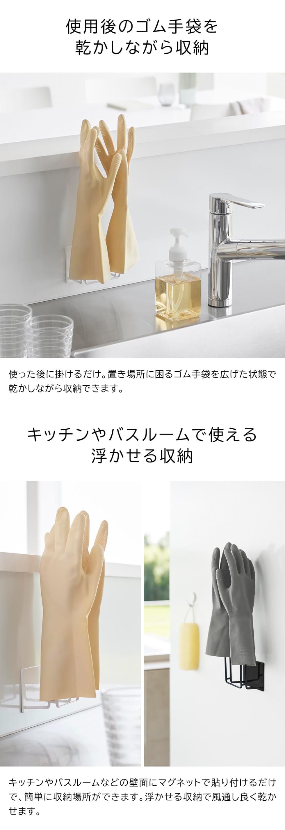 キッチンやバスルームで使用するゴム手袋を乾かしながら収納できるホルダーです。マグネットで簡単に取り付けられてすぐに使えます。保存袋やペットボトルの乾燥にも便利。
