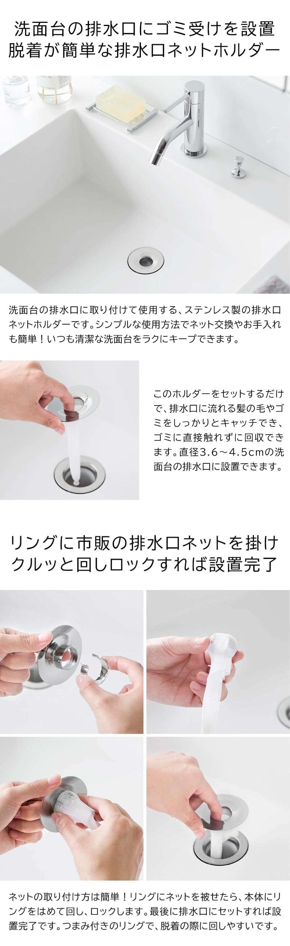 シンプルでお手入れしやすい!簡単に脱着できる排水口ネットホルダー。ステンレスのリングをはめるだけのシンプルな構造。リングを回すとロックがかかり、ネットが外れて落下するのを防ぎます。