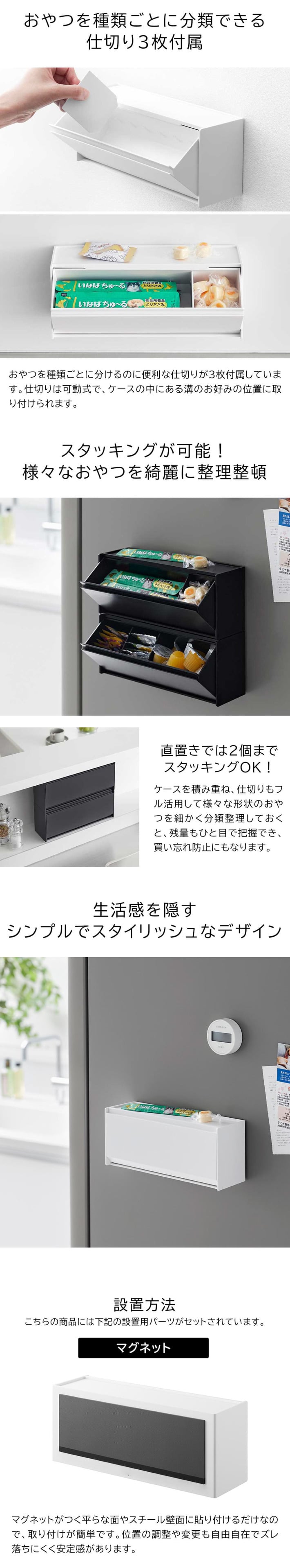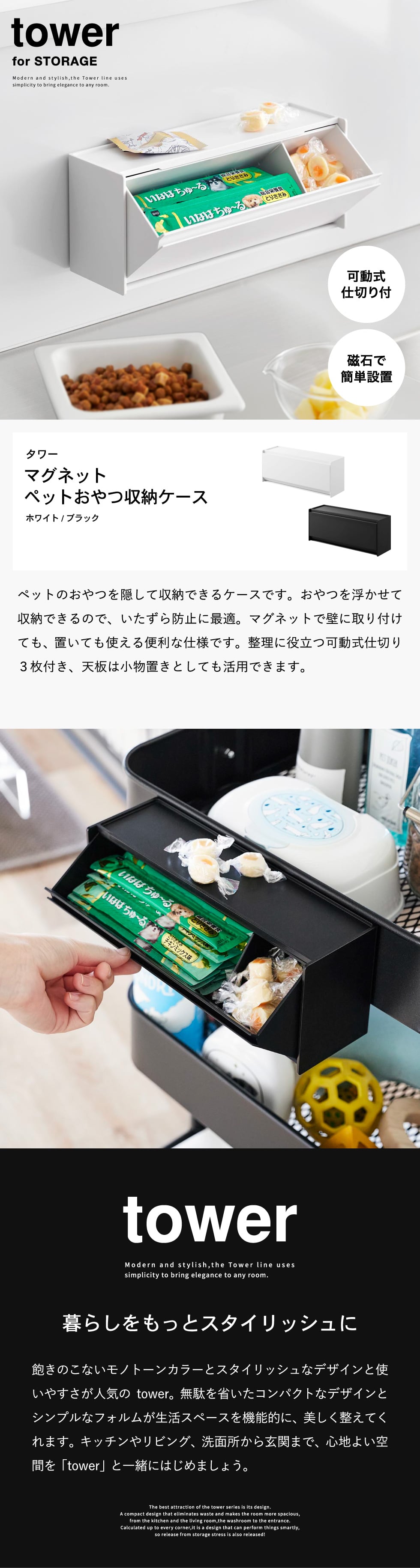 マグネットで壁に取り付けても置いても使える!ペットのおやつをスッキリ隠せる収納ケース。シンプルでスタイリッシュなデザインなので冷蔵庫横やスパイスニッチなど場所を選ばずスマートに設置できます。ペット用品をまとめた、マグネットが付くスチールワゴンの側面に設置すれば、おやつを浮かせて収納できるのでいたずら防止にも!天板はトレーになっているので小物置きとしても使用できます。ケースはフラップ式なので片手で簡単に開閉でき、整理に便利な可動式の仕切りが3枚付属しています。スタッキング可能。