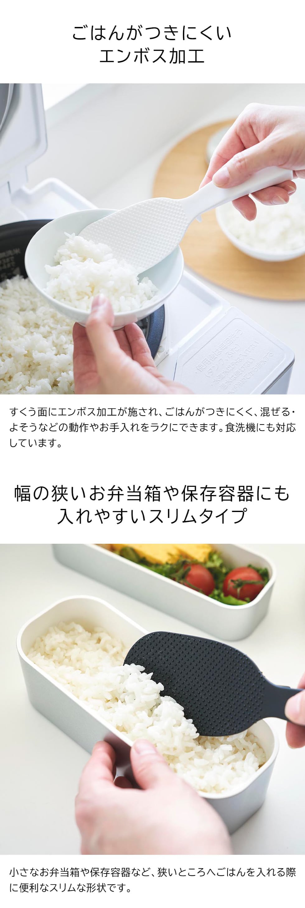 立つ・置く・掛けると便利に収納できるスリムタイプのしゃもじ。すくう面はお米がつきにくいエンボス加工。先端が浮くので直置きにならず衛生的です。幅の狭いお弁当箱にもご飯が入れやすいスリムサイズです。