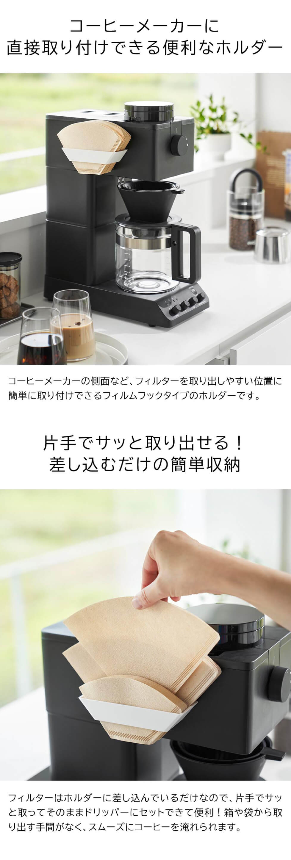 フィルムフックでコーヒーメーカーに直接取り付けられるコーヒーペーパーフィルターストッカー。扇・円すい形に対応しており用途に合わせた収納が可能です。仕切りがあることによりペーパーフィルターのよれを防止します。フィルムフックに掛けるだけの簡単設置。