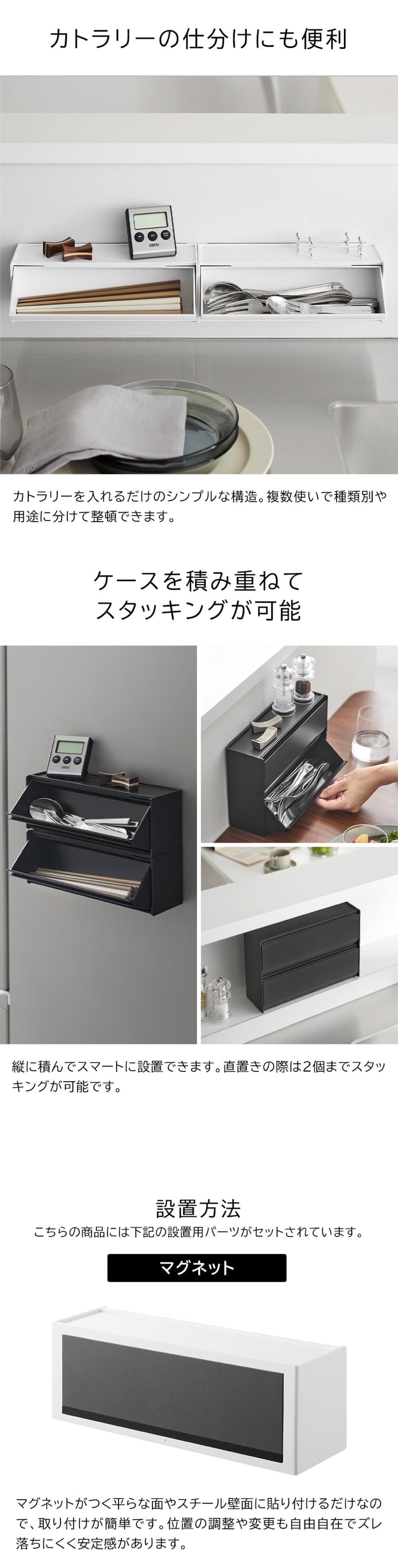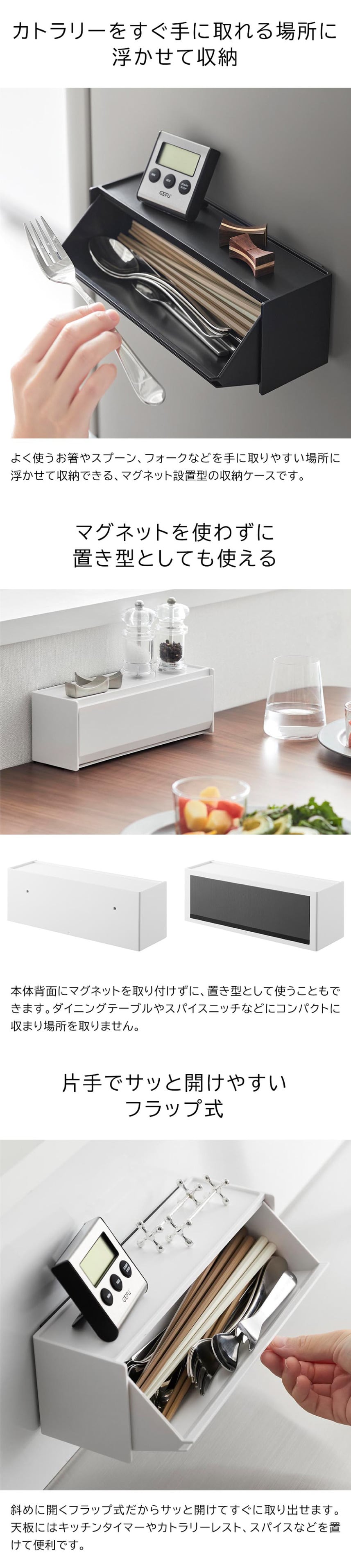 マグネットで壁に取り付けても置いても使える!カトラリーがサッと取り出しやすい便利なケースです。シンプルでスタイリッシュなデザインなので場所を選ばずスマートに設置でき、積み重ねても使用することができます。斜めに開口するフラップ式で片手で簡単にカトラリーを取り出すことができます。天板はトレーになっているので小物置きとしても便利。冷蔵庫横などにマグネットで設置したり、スパイスニッチやダイニングなどマグネットがつかない場所に置いても使用するこができるので便利です。