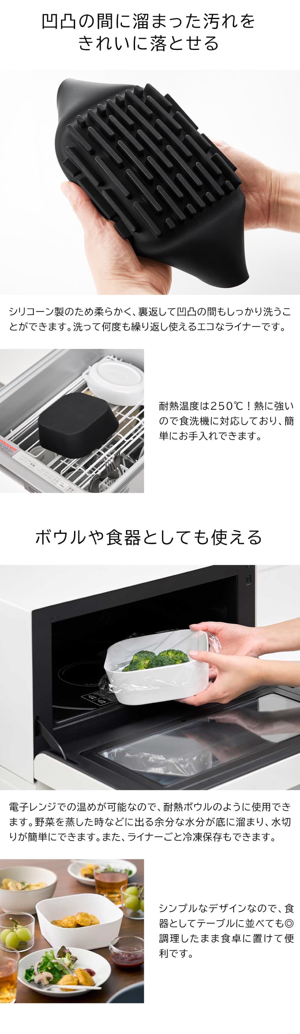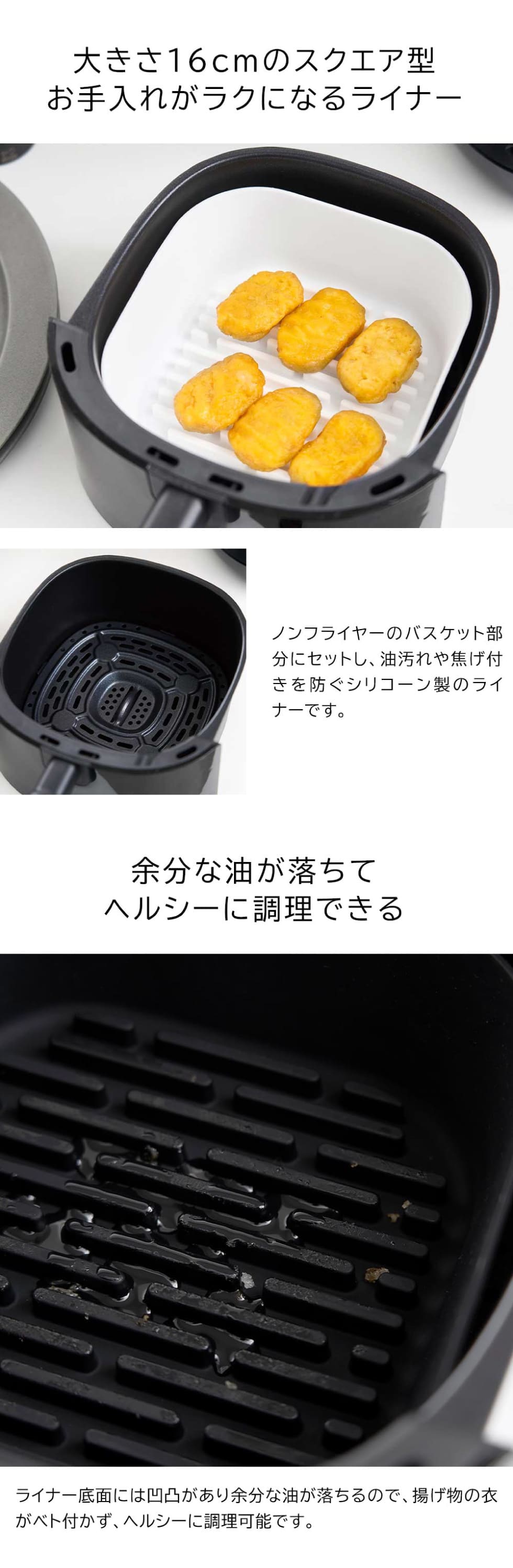 ノンフライヤーのお手入れが楽になるシリコーン製のライナー16cm。底面の凹凸により、余分な油が落ちヘルシーに調理ができます。調理後そのまま食卓に器としても出せるデザイン。ライナーを使用することでノンフライヤーの内鍋を保護し、食材が鍋底に焦げ付くのを防ぎます。シリコーン製なので裏返して凹凸の間もしっかり洗うことができます。電子レンジOK。食洗機OK。冷凍庫OK。