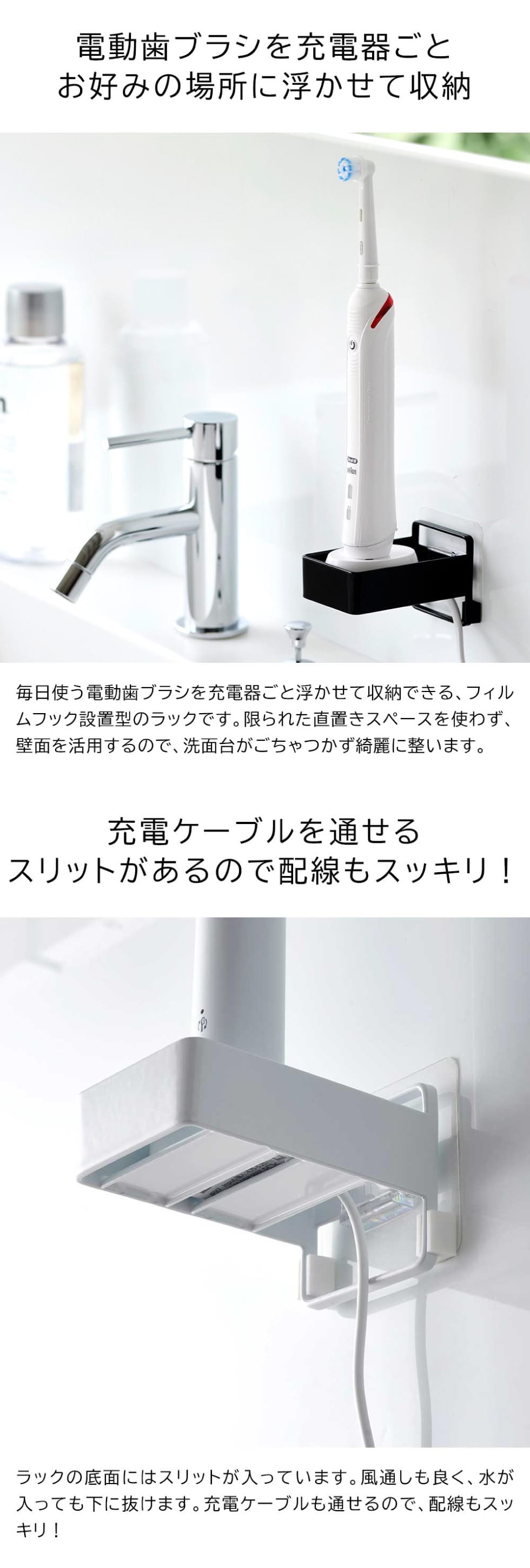 毎日使う電動歯ブラシを充電器ごとフィルムフックで壁面に浮かせて収納!使いやすい位置に配置できます。底面には充電ケーブルを通せるスリット付きで配線もスッキリ!
