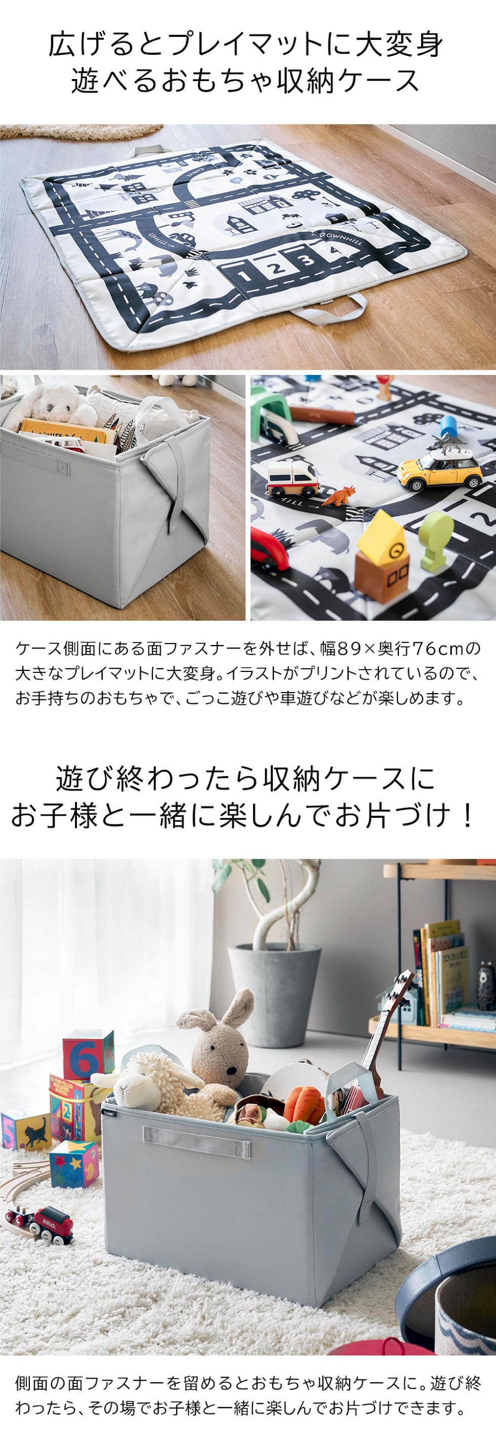 広げるとプレイマットとして遊べるおもちゃ収納ケースです。面ファスナーを外すだけで、サイズ89cm×76cmのプレイマットになります。イラストがプリントされているのでごっこ遊びや車遊びが楽しめます。側面の面ファスナーを留めると持ち手付きの収納ケースになるので持ち運びやすく、お子様と一緒に楽しんでお片付けすることができます。カラーボックスにピッタリ収まるサイズです。
