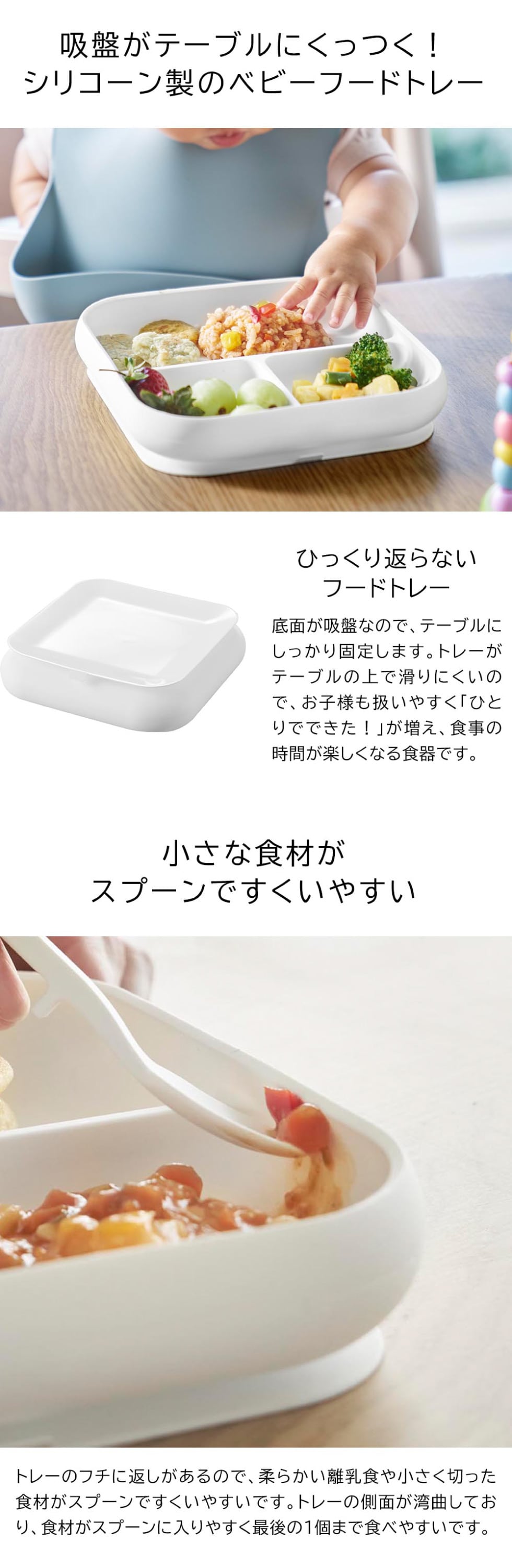 吸盤付きで仕切りがあり、トレーのフチに返しがあるのでスプーンですくいやすく、こぼれにくいシリコーン製のベビーフードトレーです。シリコーン製でしっかり吸着するので、手づかみ食べの時期のお子様にもおすすめです。取り外し用タブを持ち上げると吸盤が外れます。食洗機OK。電子レンジOK。冷凍庫OK。