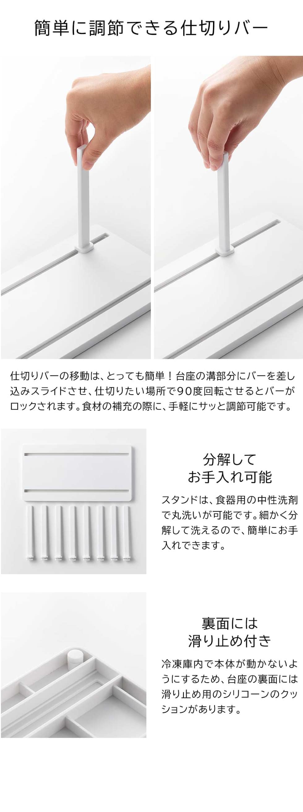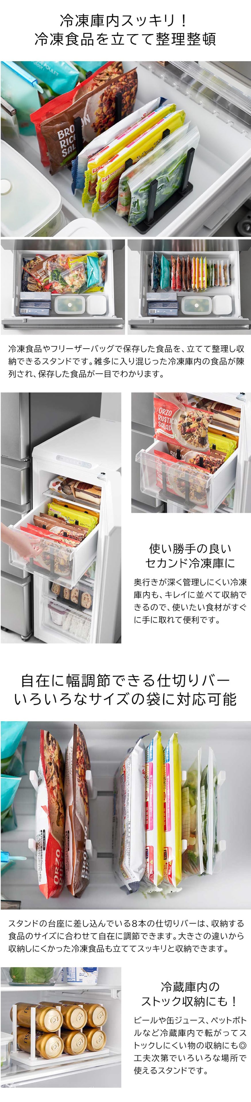 冷凍庫の食品を立てて整理できる冷凍庫中収納スタンドです。仕切りバーは収納物のサイズに合わせて調節が可能で、本体裏面には引き出しの開閉時にずれにくい滑り止め付き。スッキリと綺麗に整理できるのでセカンド冷凍庫への使用にもおすすめです。