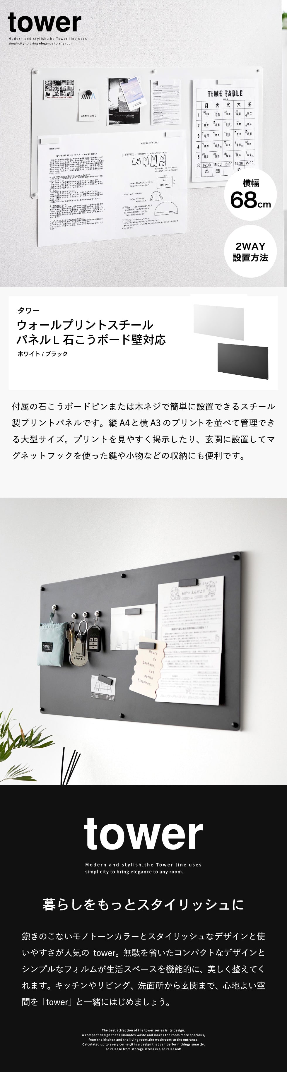 ホワイトとブラックを中心とした飽きのこないモノトーンカラーと、どんなインテリアにもスッと馴染むスタイリッシュなデザイン。そして、とことんシンプルながら、より豊かな暮らしを提案するアイデアがたくさん詰まった、使いやすいアイテムが人気です。無駄を省いたコンパクトなデザインと、シンプルなフォルムが生活スペースを機能的に、美しく整えてくれます。towerのアイテムをライン使いすれば、すっきりとした統一感が生まれ、お洒落でシックな雰囲気を演出します。キッチンやリビング、洗面所から玄関まで揃えたくなるtowerシリーズで、毎日の暮らしを彩る心地よい空間を。