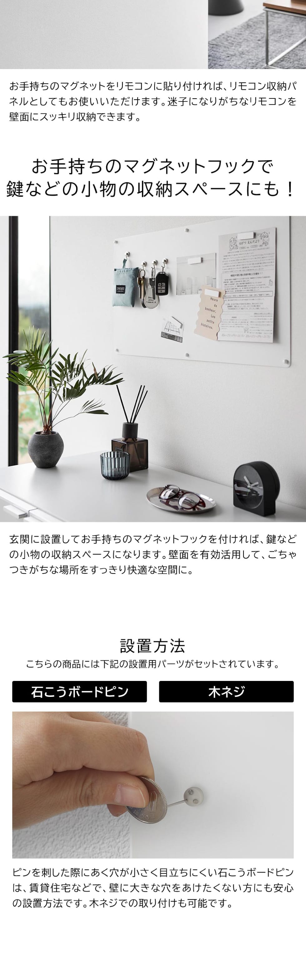 付属品 石こうボードピンセット(取り付けピース×6 クギ×18 キャップ×6) 木ネジ×6 マグネット×4 |