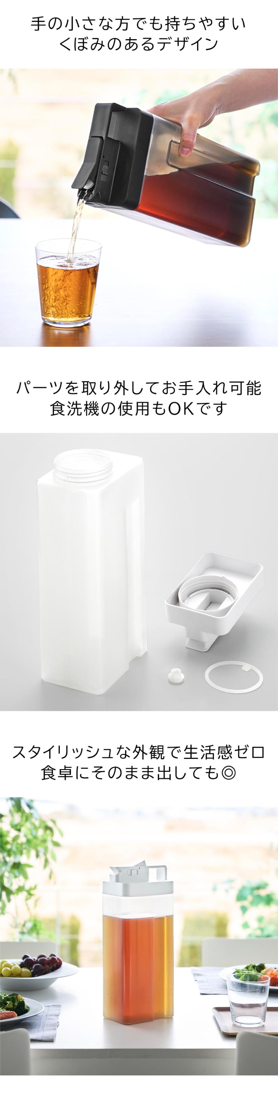 冷蔵庫の棚に倒して置いて、そのまま注げる便利な冷水筒です。2.2Lの大容量ながら、ドアポケットにもスッキリ収まるサイズ設計です。くぼみがあるので持ちやすく注ぎやすい形状。注ぎ口はあけた状態を維持できるので、冷蔵庫から出さずに直接ドリンクを注げて便利です。食洗機OK。パーツは取り外してお手入れ可能。※注ぎ口の奥側の小さなバルブは外さないでください。