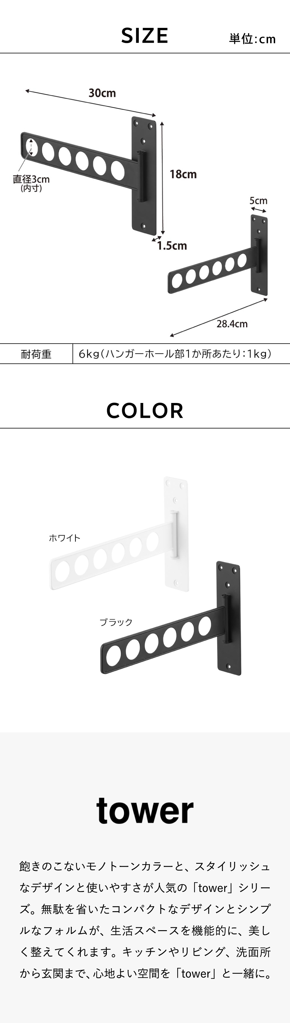 使いたい時だけサッと広げて、使わない時はペタンと畳んでスリムに収納。壁面に付属の石膏ボードピンで設置する6連衣類ハンガー。 タワーシリーズ