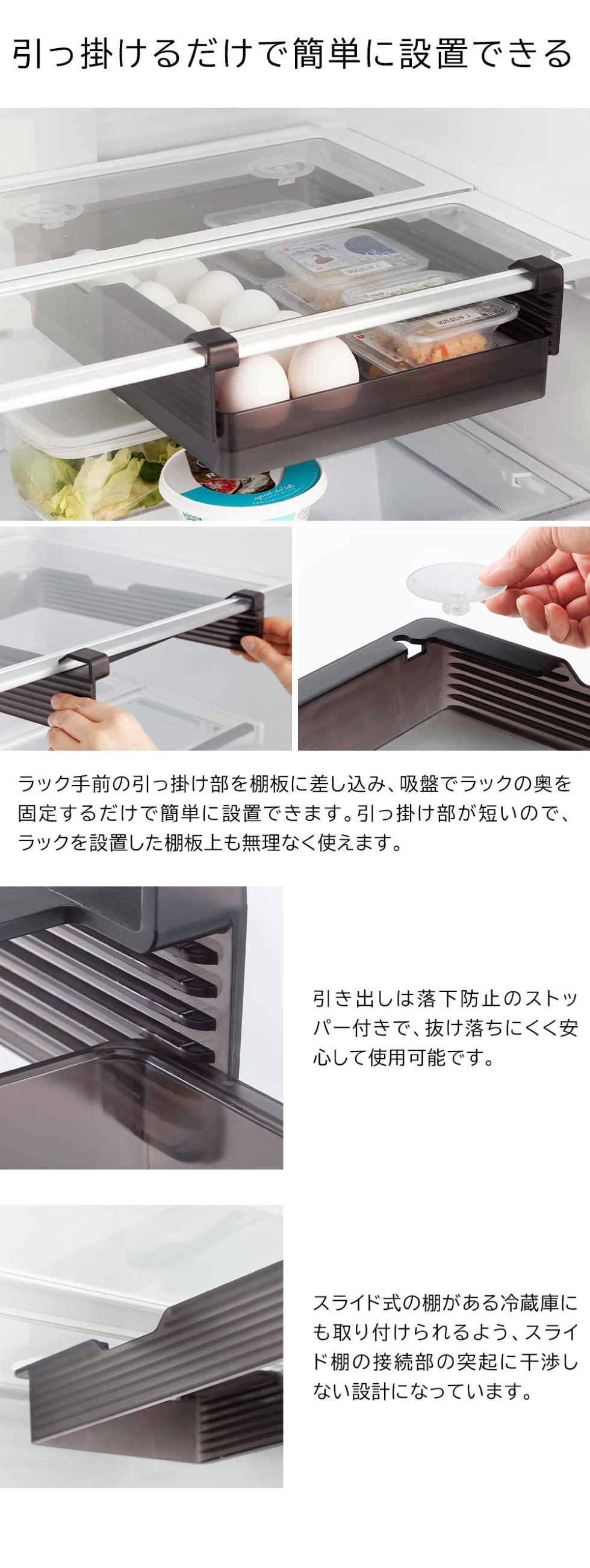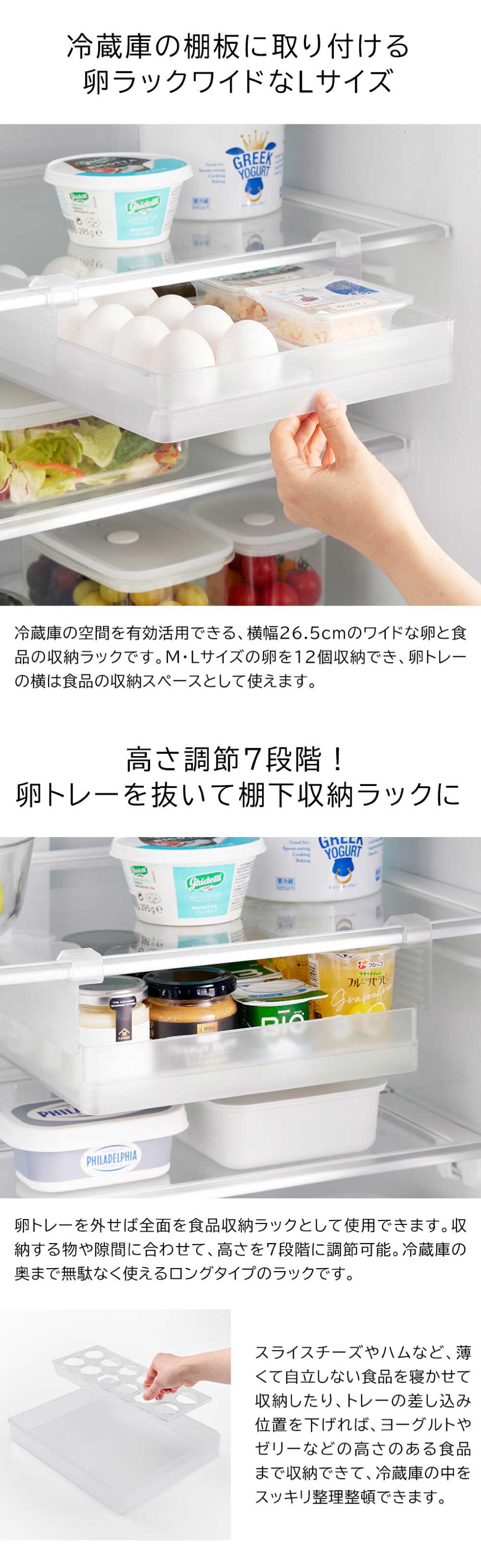 収納する物や隙間に合わせて高さを7段階に調節できる、棚下12個用卵ラックワイドです。棚の奥まで無駄なく使えるロングタイプ。スライド棚の接続部があっても取り付け可能です。設置は、引っ掛け部を棚板に差し込み、吸盤で固定するだけの簡単仕様。引っ掛け部が短いので、棚板上も有効に使えます。幅11cmの「冷蔵庫中シリーズ(別売)」が2個ピッタリ収まる設計で、空間を有効活用できます。引き出しは落下防止構造なので、安心して使用可能。卵収納から、ヨーグルトやゼリーなど高さのある食品まで、収納する物に合わせて高さを調節できるので、冷蔵庫の中をスッキリ整理整頓できます。卵トレーは取り外し可能で、(別売)を追加すれば卵を24個収納できます。