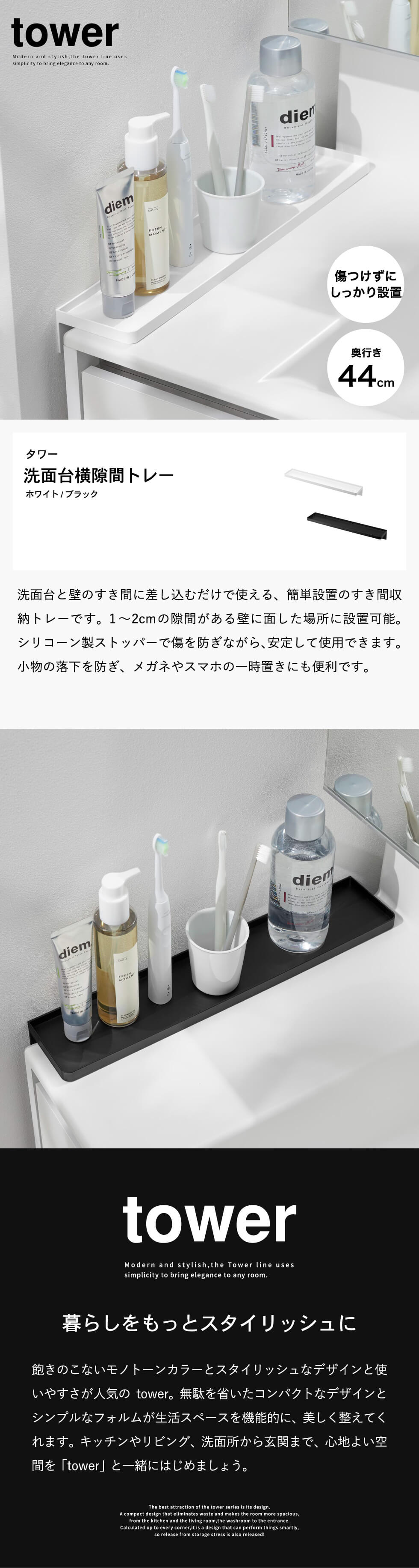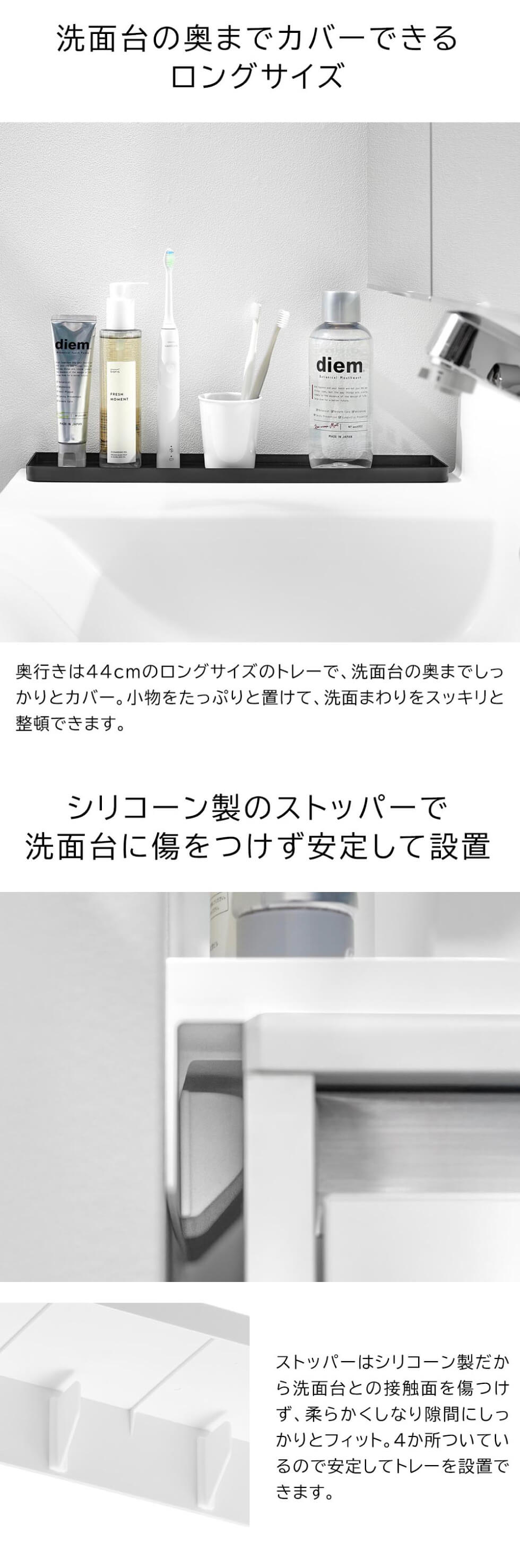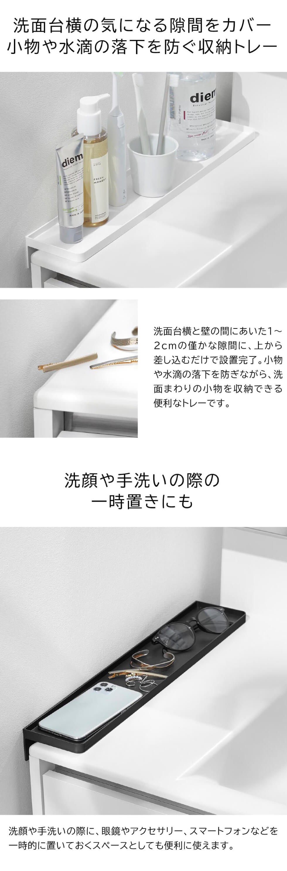 洗面台横と壁の隙間に差し込んで設置!隙間に小物が落下するのを防止し、洗面小物を置くことができるトレーです。1~2cmの隙間がある壁に面した場所に設置でき、シリコーン製のストッパーは洗面台をキズつけずトレーが安定する構造です。トレーは奥行きが44cmあるので洗面台を有効に使用することができ、メガネやアクセサリー、スマートフォンなどのちょい置きスペースとしても便利です。