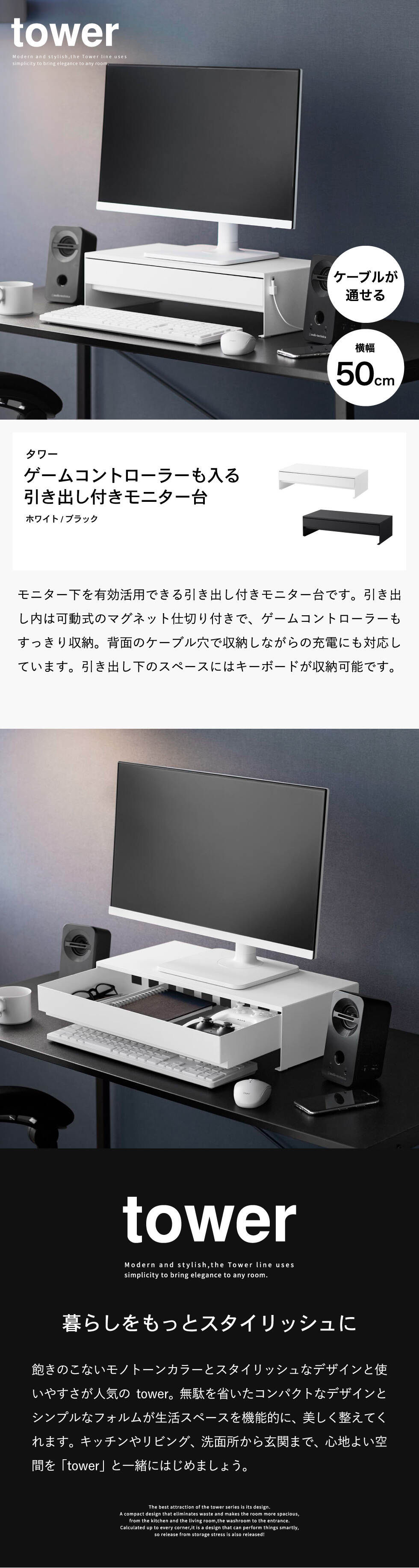ホワイトとブラックを中心とした飽きのこないモノトーンカラーと、どんなインテリアにもスッと馴染むスタイリッシュなデザイン。そして、とことんシンプルながら、より豊かな暮らしを提案するアイデアがたくさん詰まった、使いやすいアイテムが人気です。無駄を省いたコンパクトなデザインと、シンプルなフォルムが生活スペースを機能的に、美しく整えてくれます。towerのアイテムをライン使いすれば、すっきりとした統一感が生まれ、お洒落でシックな雰囲気を演出します。キッチンやリビング、洗面所から玄関まで揃えたくなるtowerシリーズで、毎日の暮らしを彩る心地よい空間を。