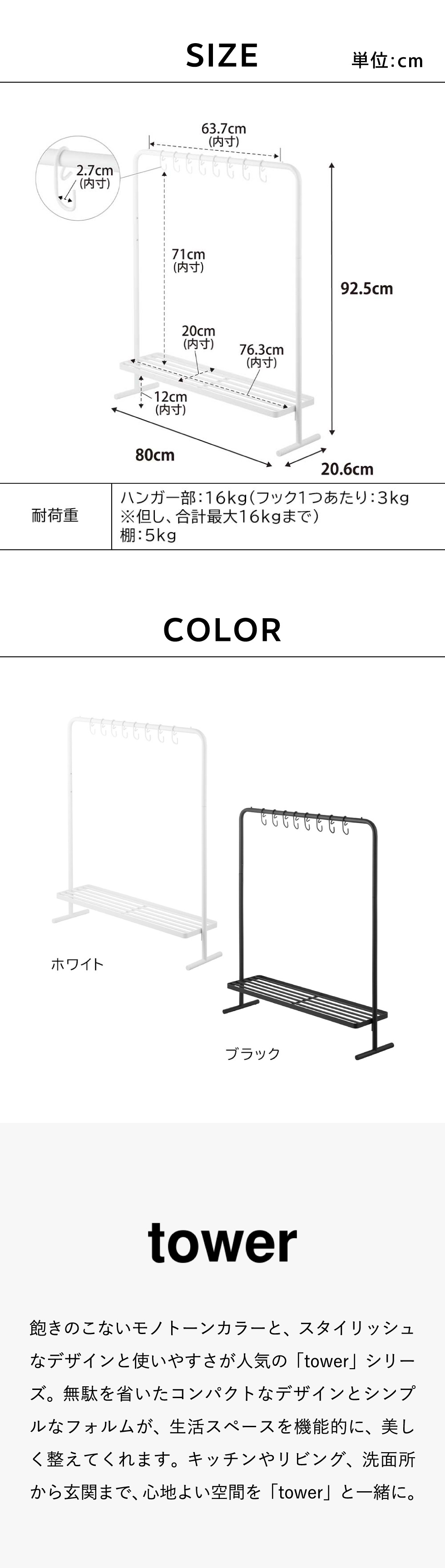 耐荷重 ハンガー部:16kg(フック1つあたり:3kg ※但し、合計最大16kgまで) 棚:5kg (静止荷重) |